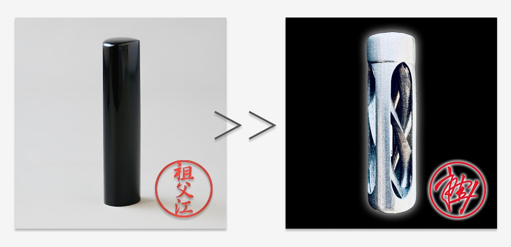ハンコには珍しい螺旋構造を採用し、その構造も一から開発、更に印影は書道家・祖父江があなたのお名前を吟味し一点モノで制作するため、生まれたハンコは世界に二つとない唯一無二のハンコといえます。