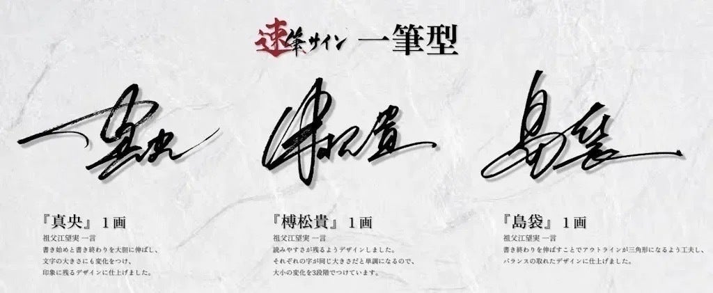 書道家として培った技術と速筆サインを創り続けてきた経験から、文字本来の美しさを損なわずにそれぞれの文字の魅力を引き出し、一筆に仕上げる全く新しいサインが完成しました。