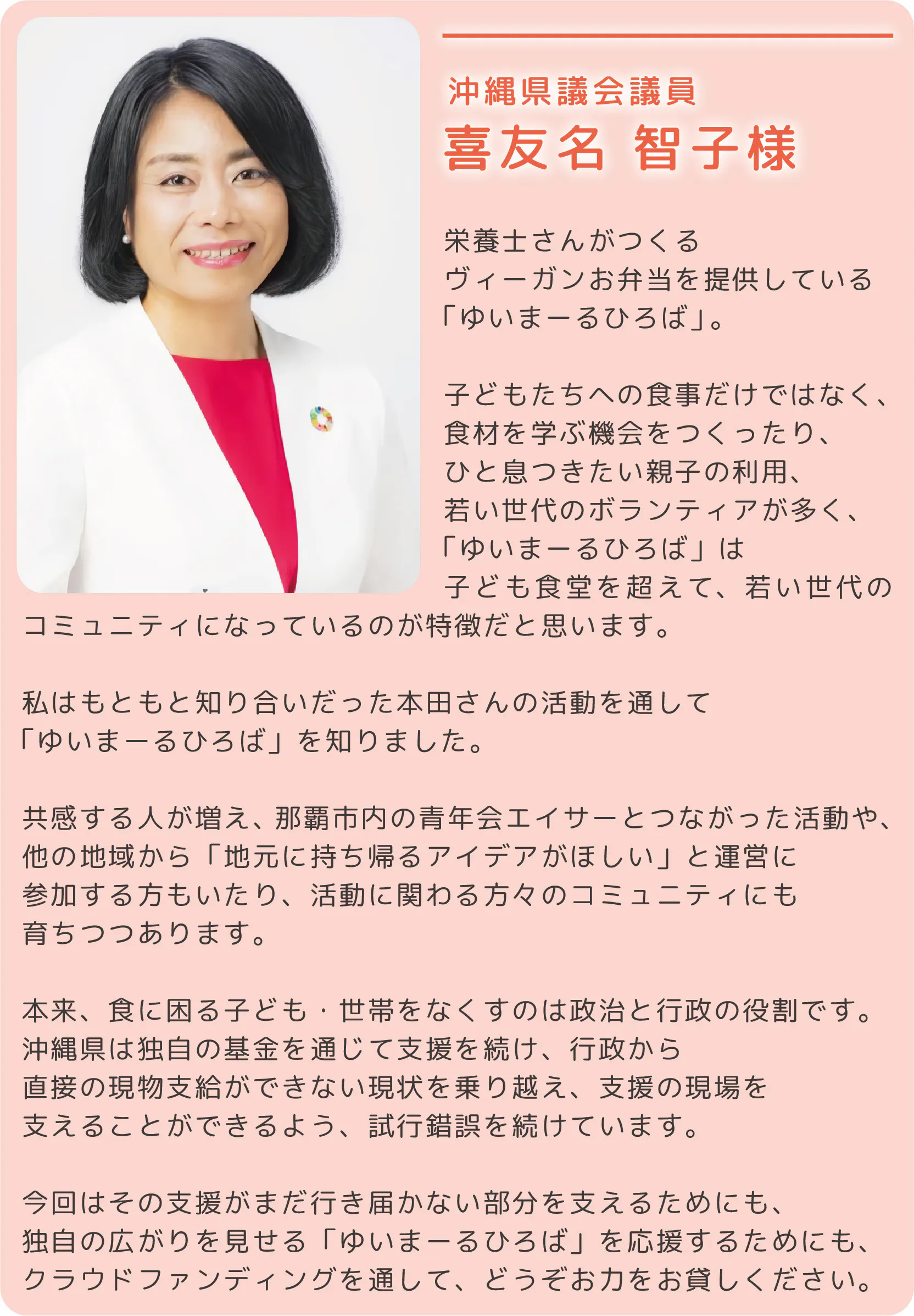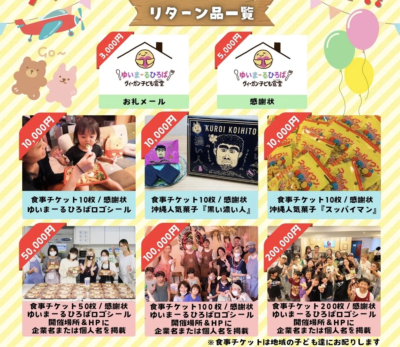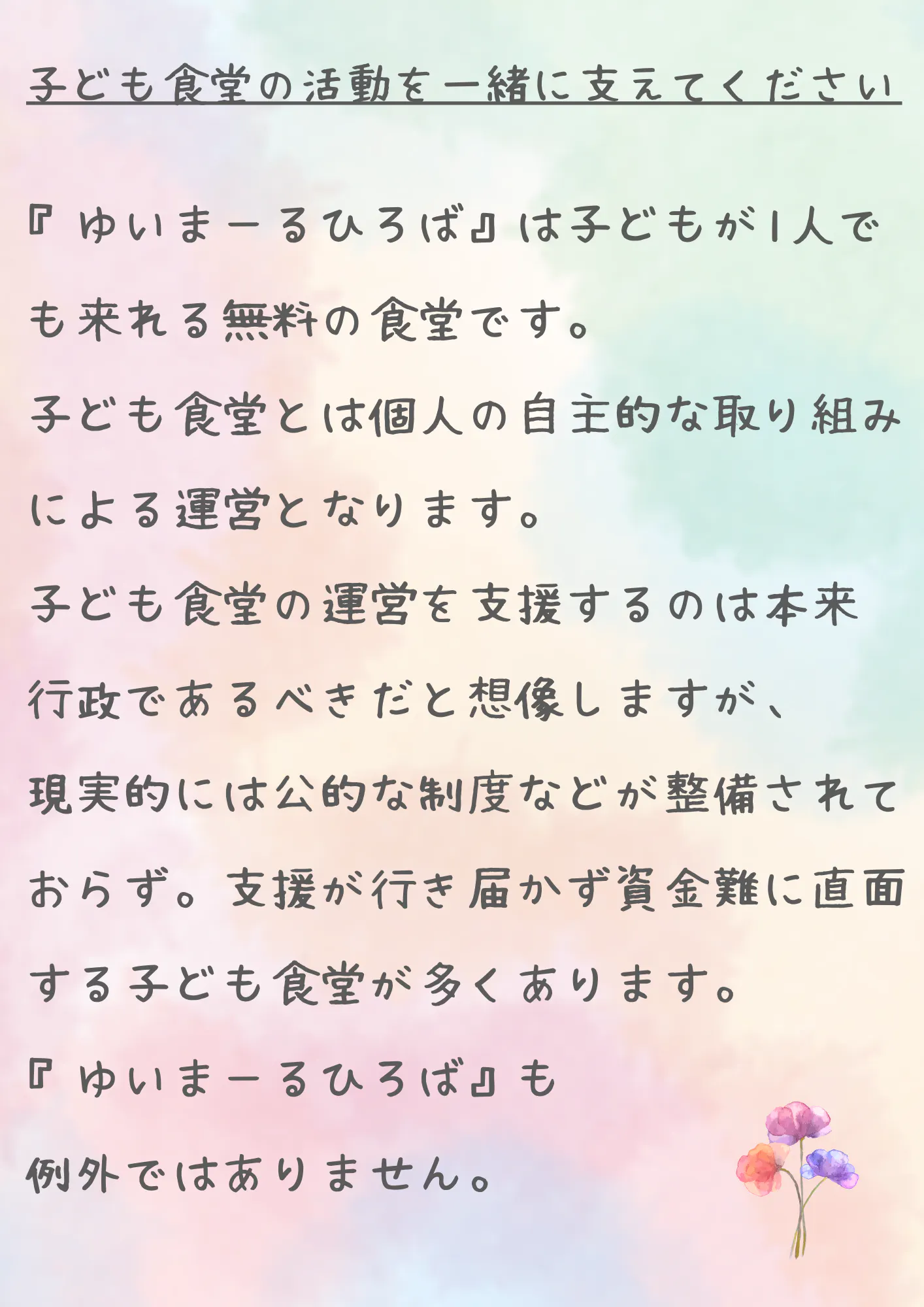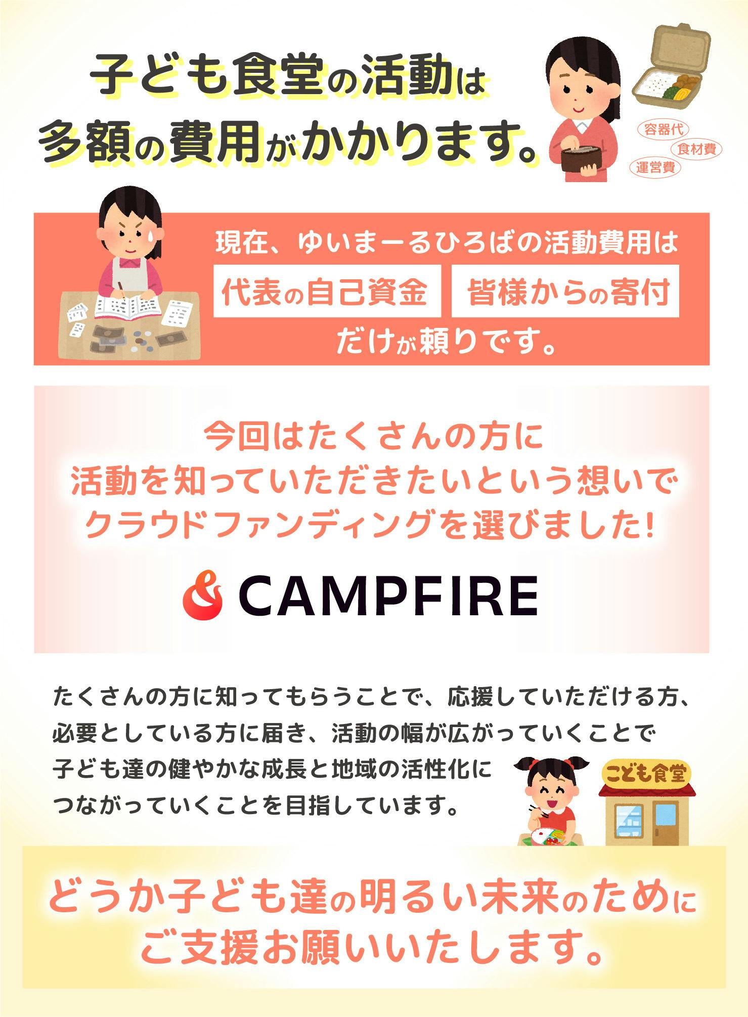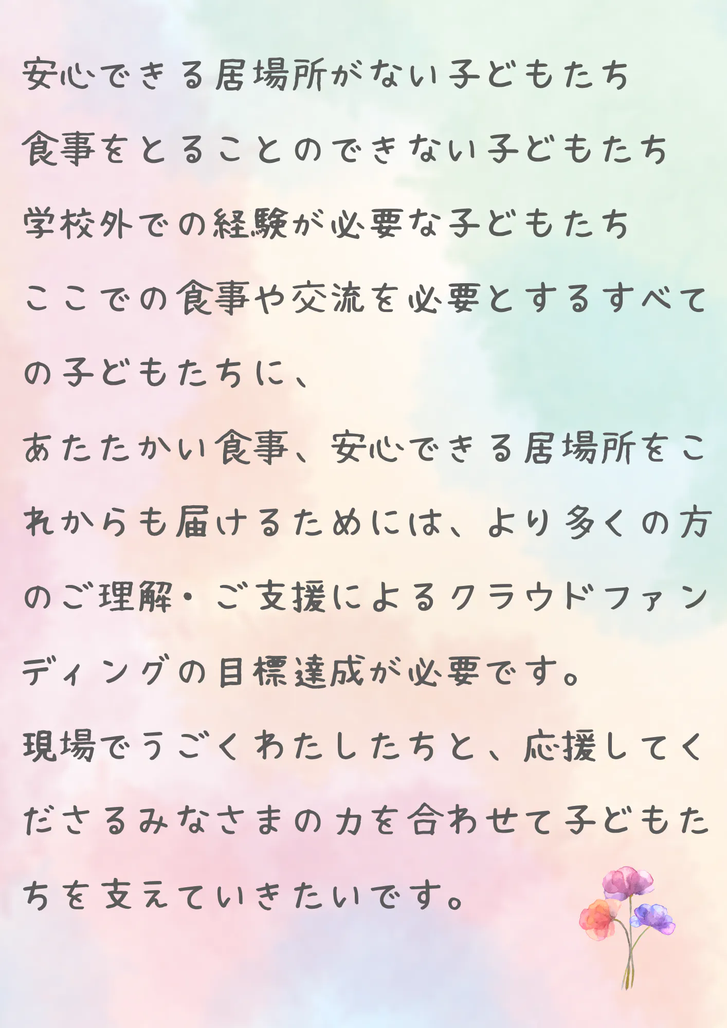 今回はその支援がまだ行き届かない部分を支えるためにも、独自の広がりを見せる「ゆいまーるひろば」を応援するためにも、クラウドファンディングを通して、どうぞお力をお貸しください。』