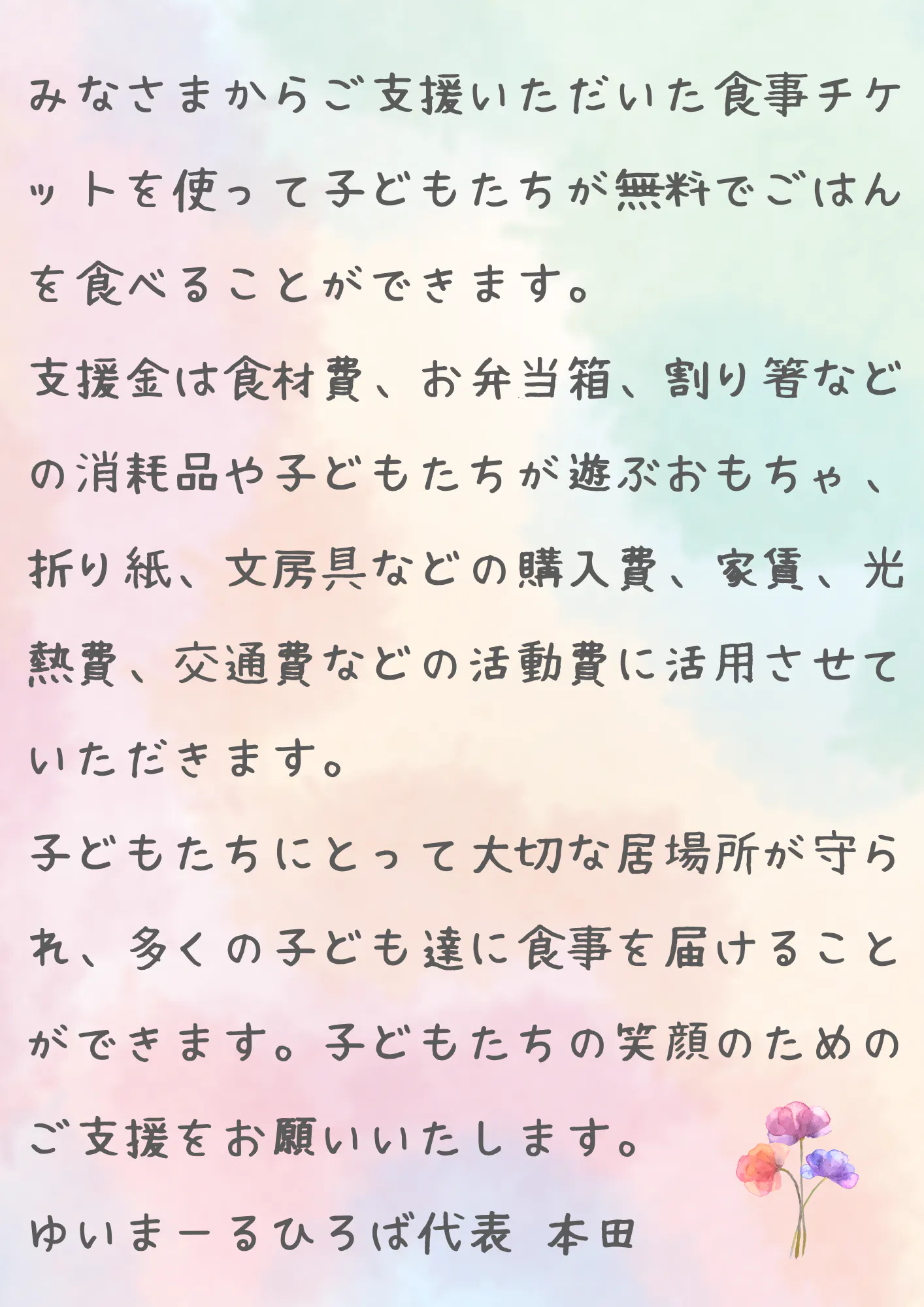 ①ご支援いただいた食事チケットはゆいまーるひろばスタッフが、学校や行政の協力のもと地域の子どもたちにお配りします。郵送でのお届けはありません。