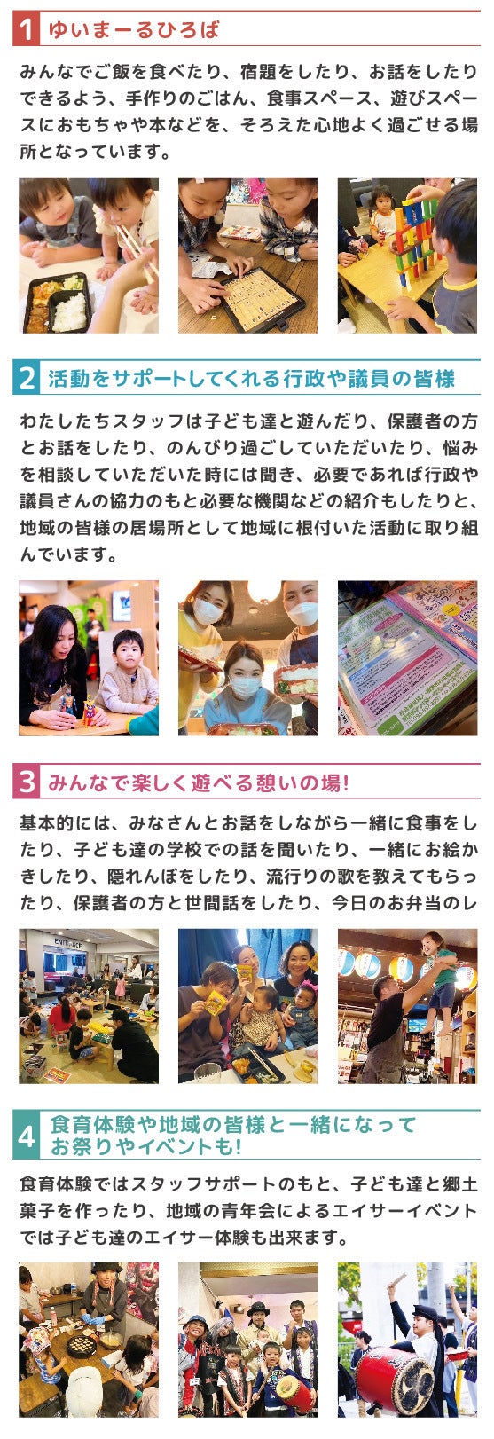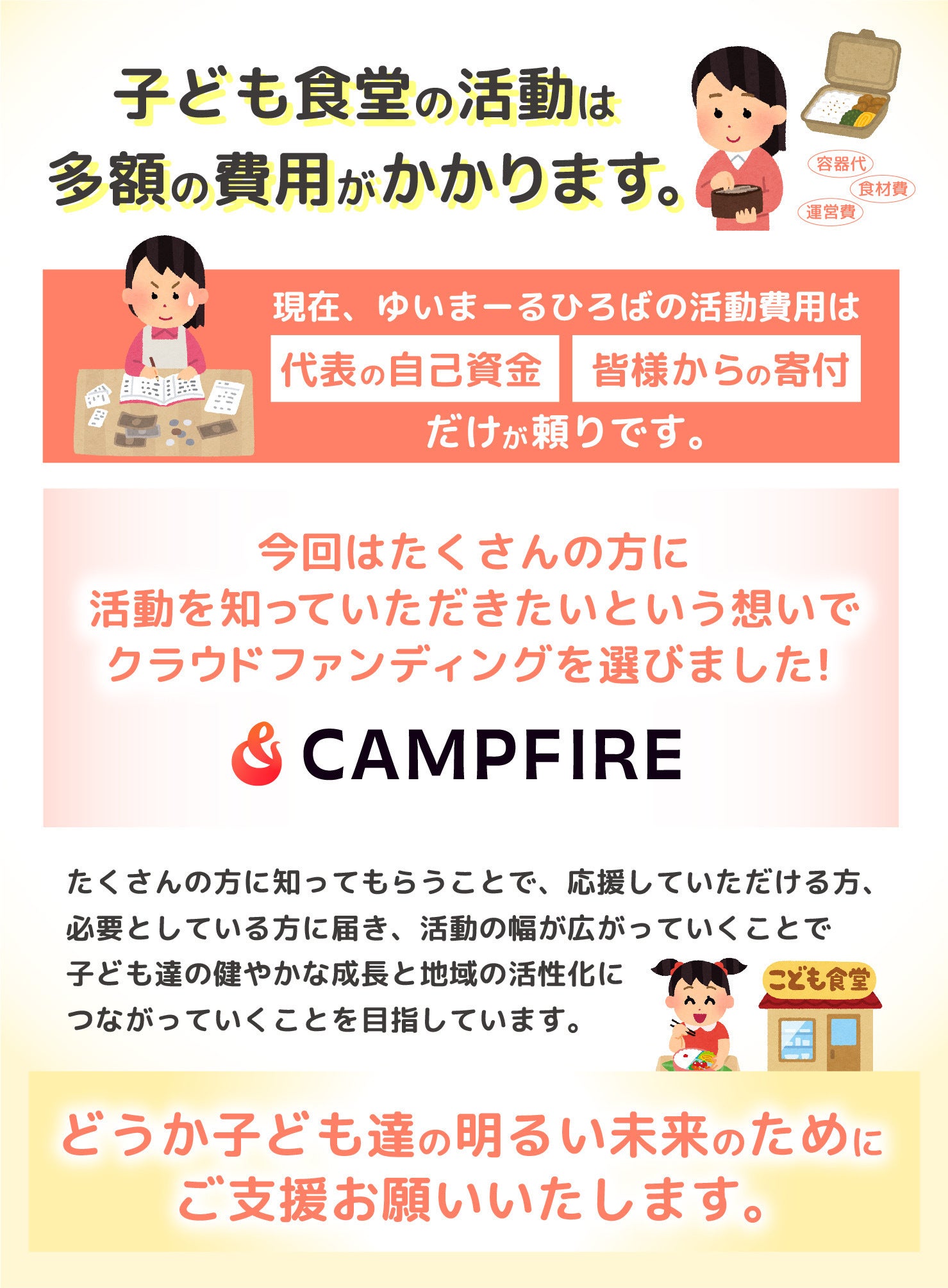 今回はその支援がまだ行き届かない部分を支えるためにも、独自の広がりを見せる「ゆいまーるひろば」を応援するためにも、クラウドファンディングを通して、どうぞお力をお貸しください。』