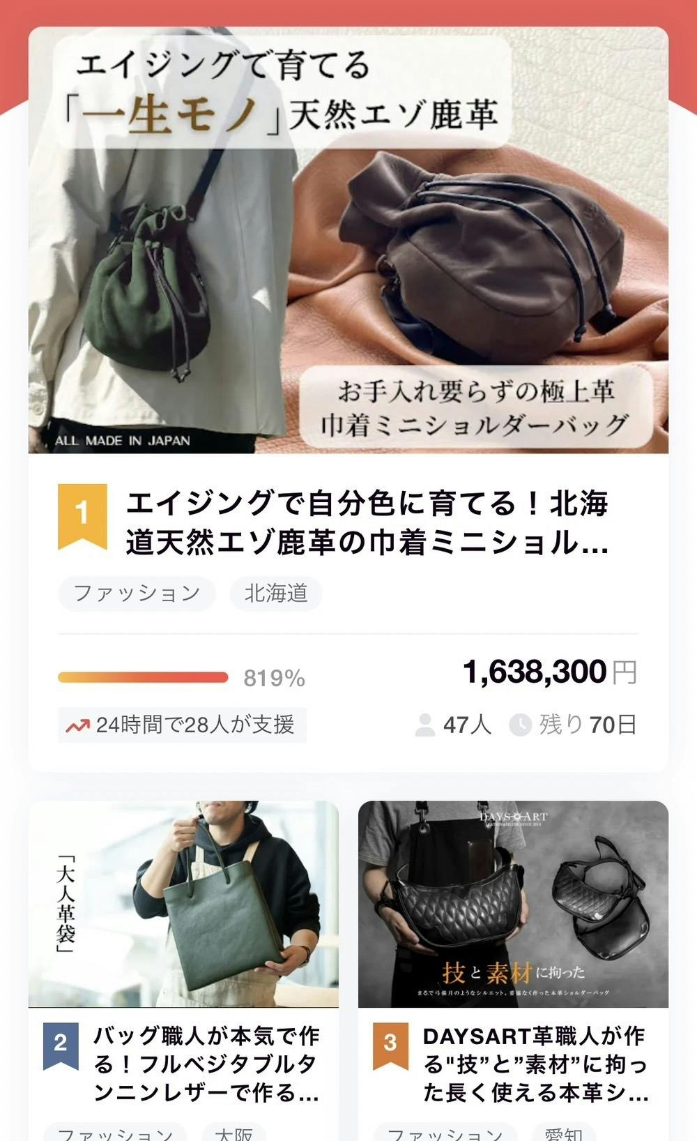 昨日スタートした新プロジェクト『天然エゾ鹿革の巾着ミニショルダーバッグ』ですが、おかげさまでCAMPFIREのファッションランキング1位を獲得することができました!