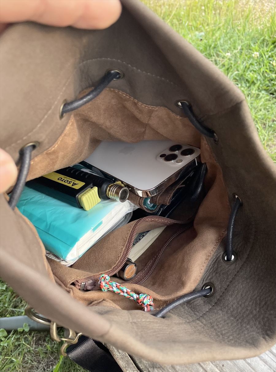 ペットボトルも入ります!エゾシカ革は触り心地がいいのでずっと触りたくなる感触です!
