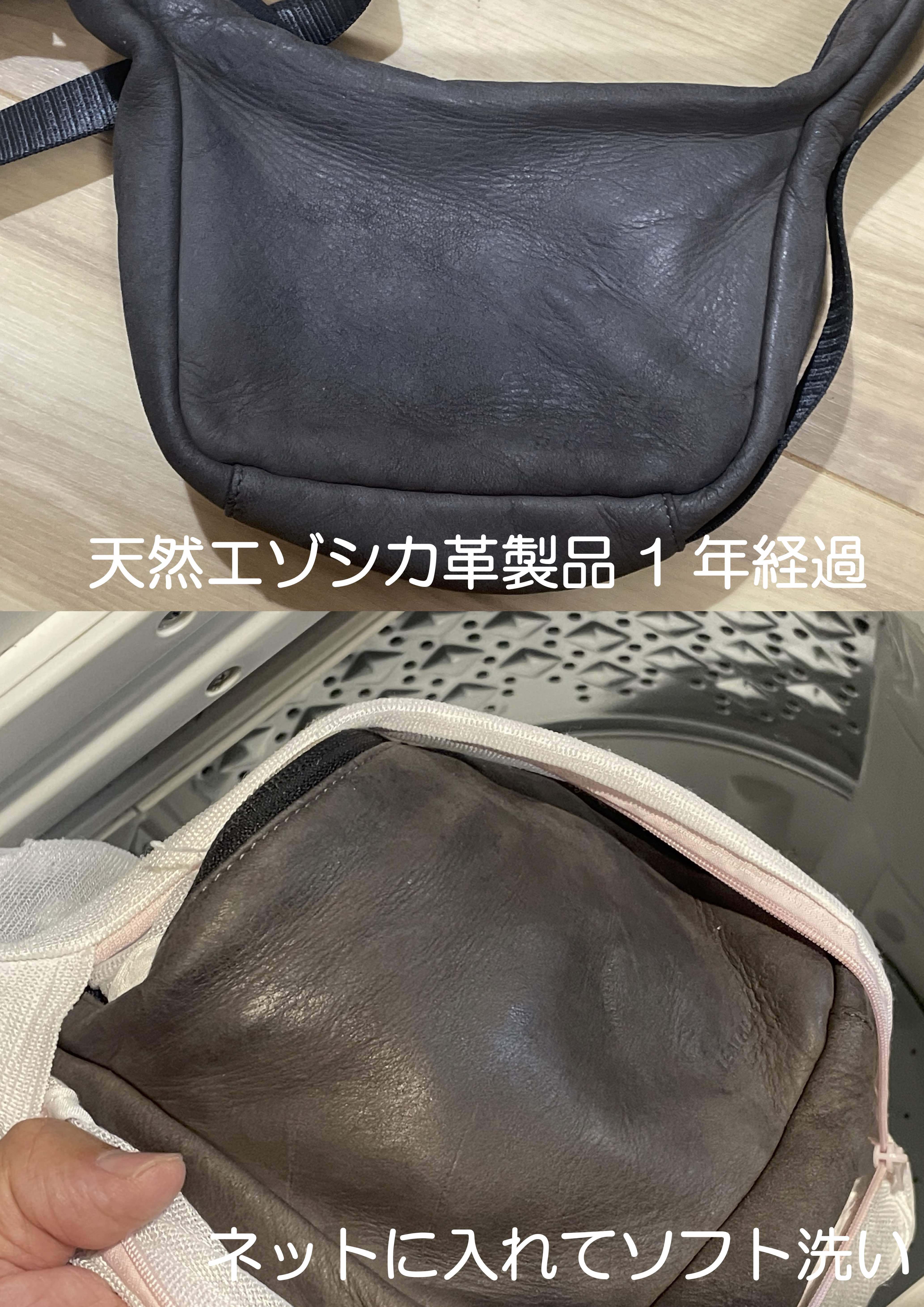 (※巾着ミニショルダーのサンプルはまだ作製して時間が経っていないので同じ革を使用した天然エゾシカ革ににショルダーバックの洗濯比較写真を添付します。)