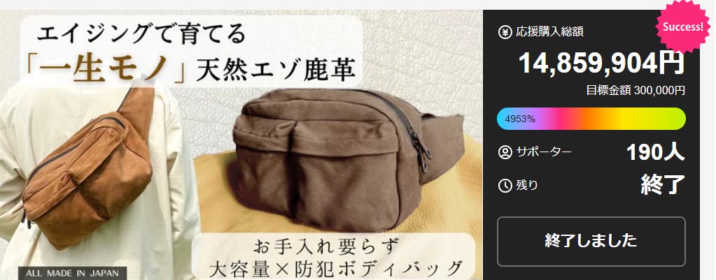 国内クラウドファンディングにて総額1,485万円を達成した『北海道天然エゾ鹿革ボディバッグ』を、いよいよCAMPFIREにて販売開始いたします。