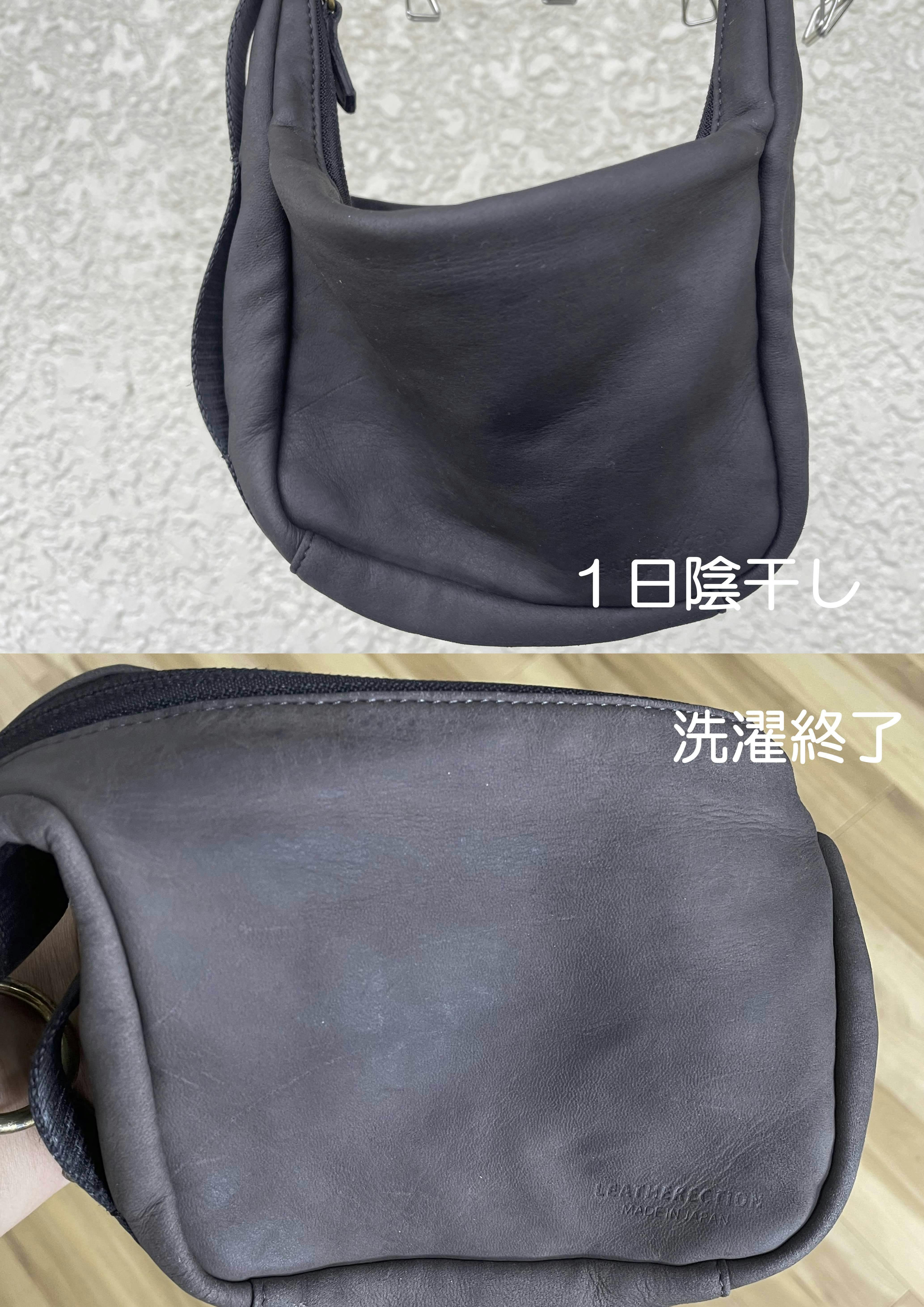 写真は今回のショルダーバッグと全く同じ革のバッグを弊社で洗濯実験した際の様子です。