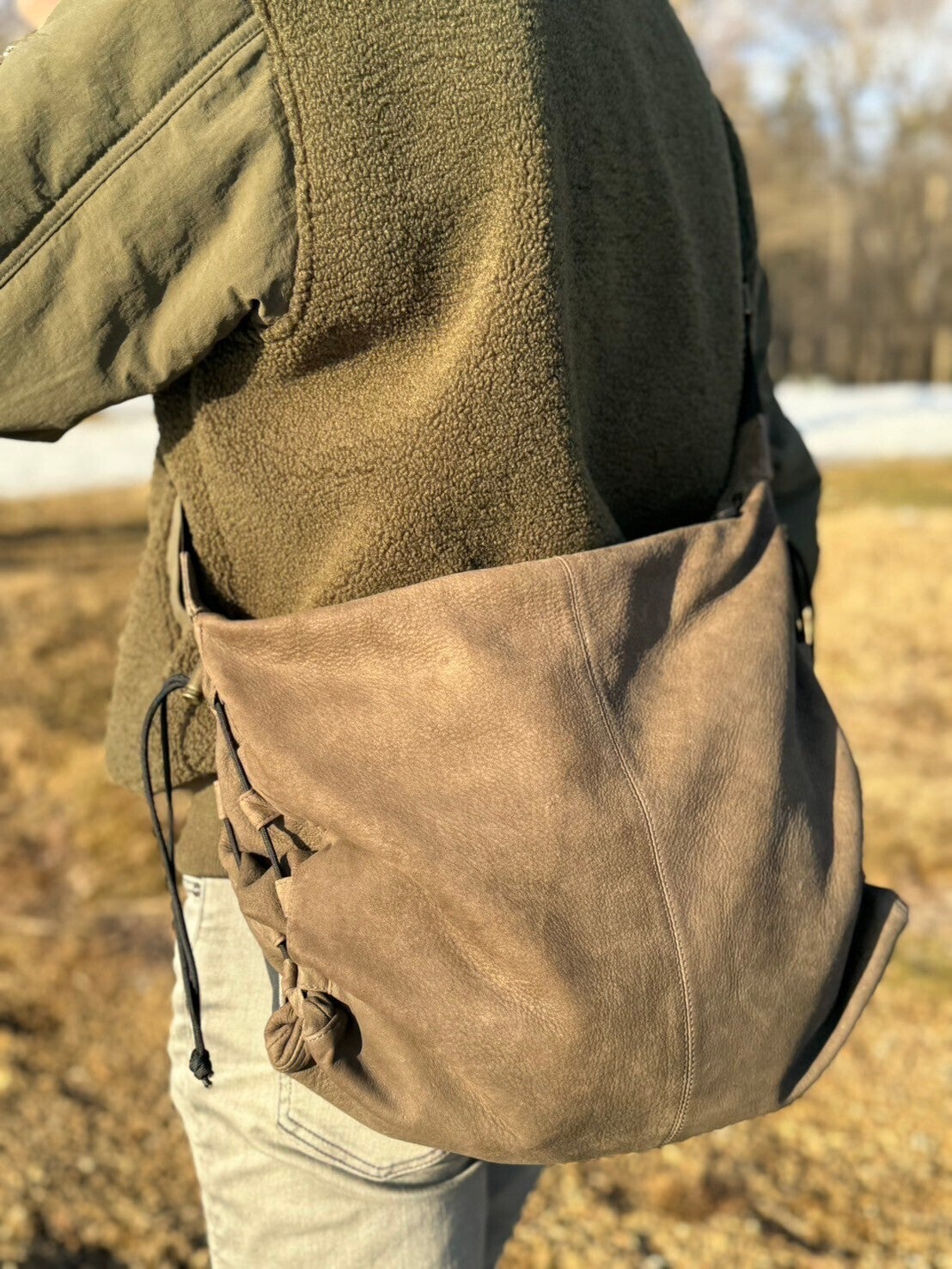 皆さまのご意見を元に、試作を積み重ねた私たちの自信作「伸縮自在な大容量天然エゾシカ革エゾシカ革ショルダーバッグ!!
