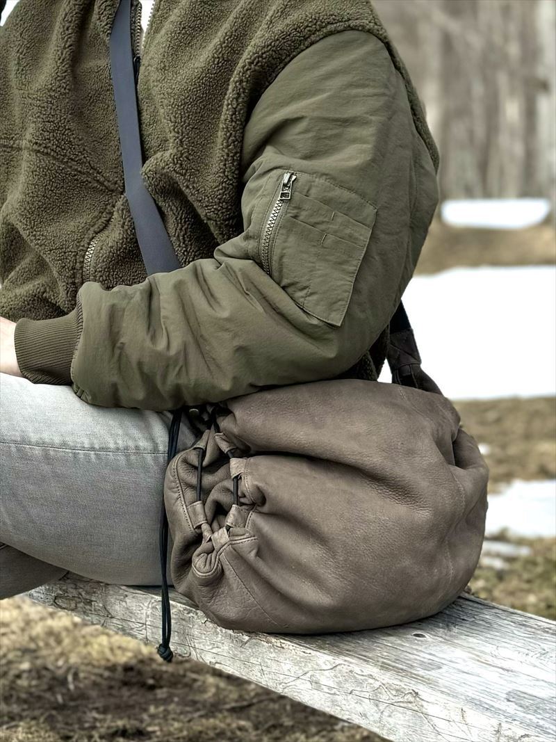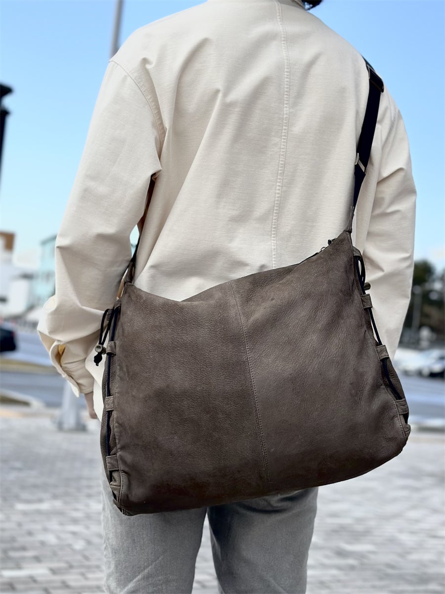 荷物がたっぷり入り、容量も変えられ、エゾ鹿革の良さを体感できるショルダーバッグ。