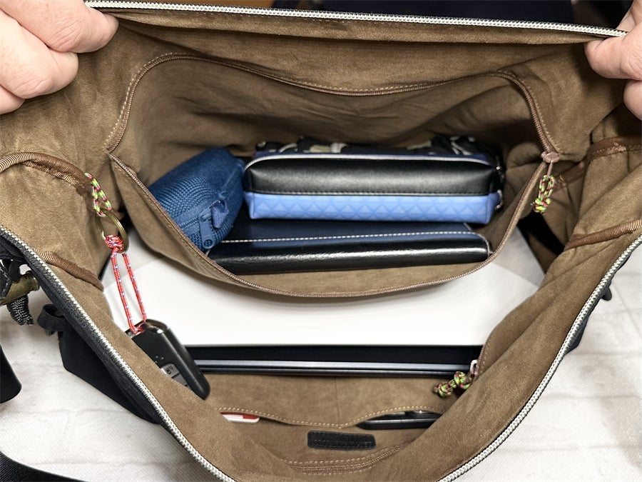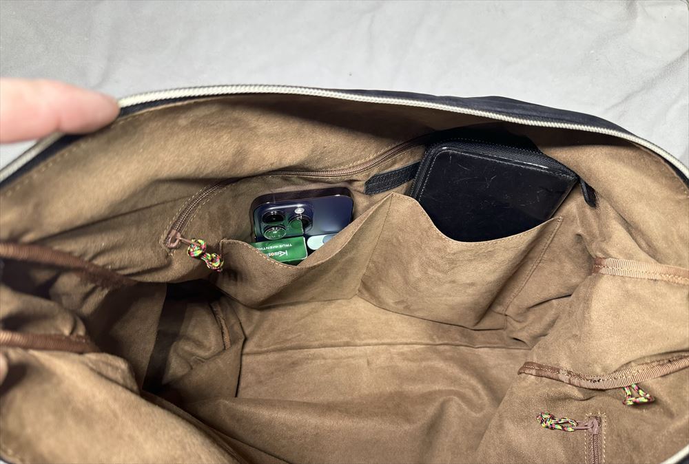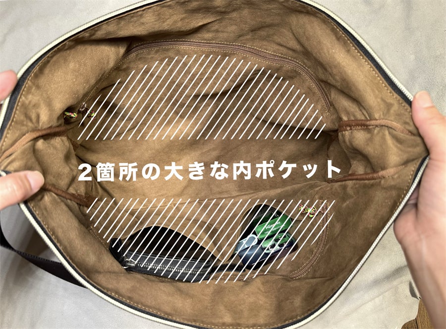 内側の両サイドに大きくファスナー付きの内ポケットを用意。