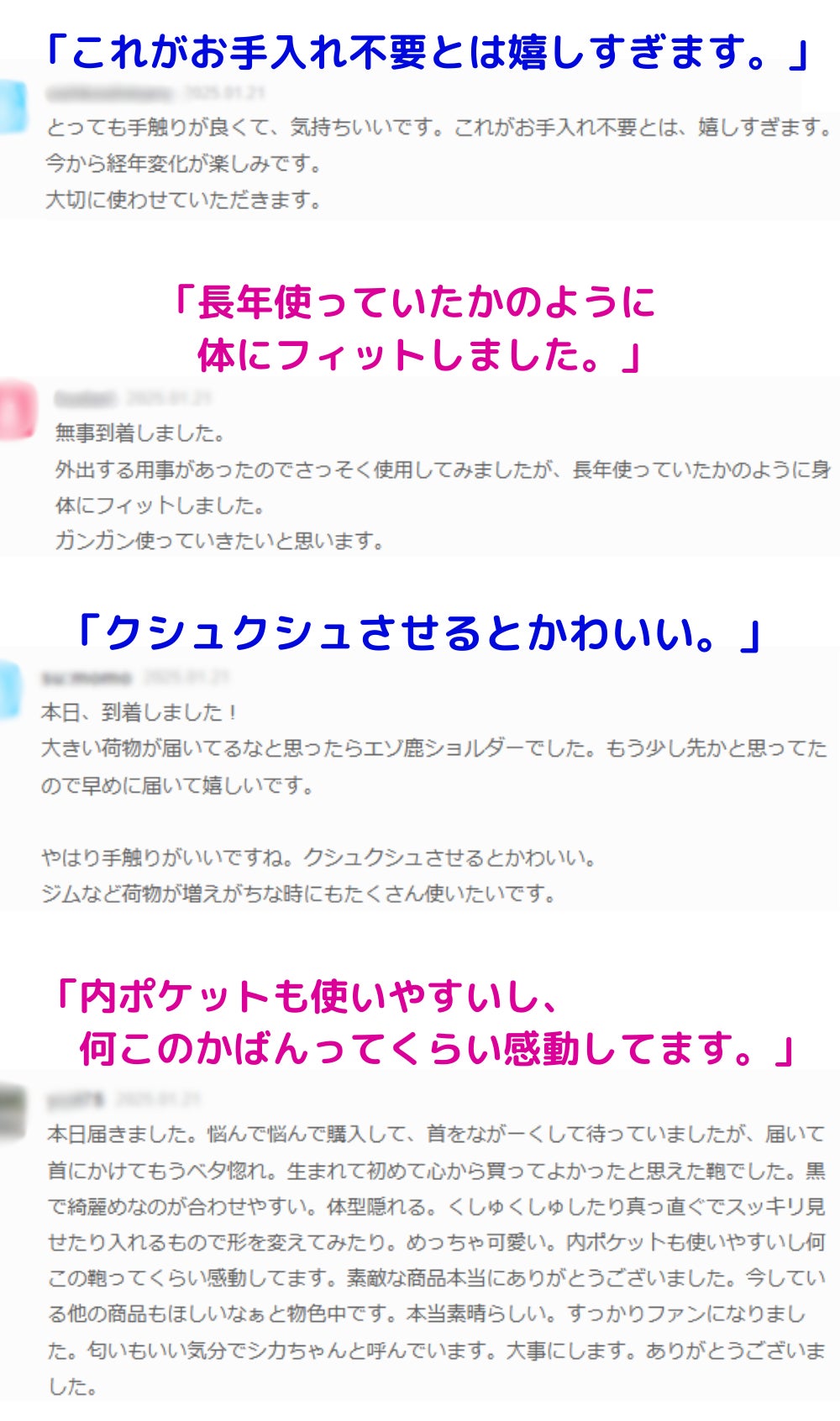今回と同じ鹿革ショルダーバッグをご購入いただいたお客様からのお声です。