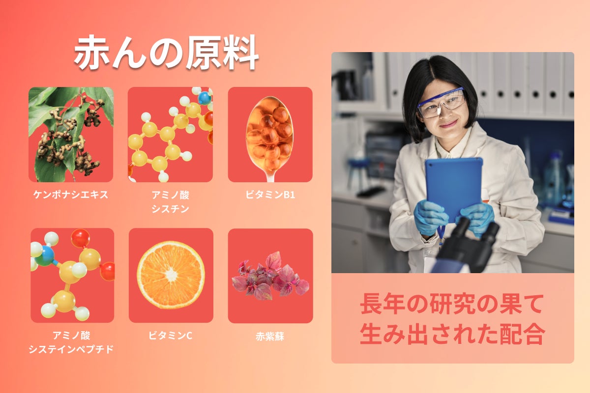 赤んの原料を細かく説明いたしますと、ケンポナシエキス、シスチン(アミノ酸)、ビタミンB1、システンペプチド(アミノ酸)とビタミンCです。これらの成分は全て赤ら顔の原因となる、アセトアルデヒドを分解する作用を持っている成分です。長年の研究の末、我々はこの5つの成分が混じり合わさることで赤ら顔対策に最も効果的な配合ができることを突き止めました。