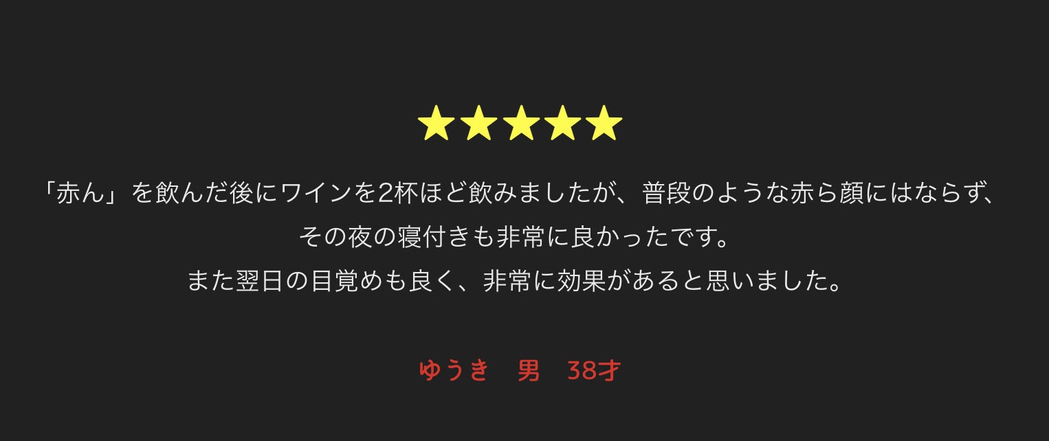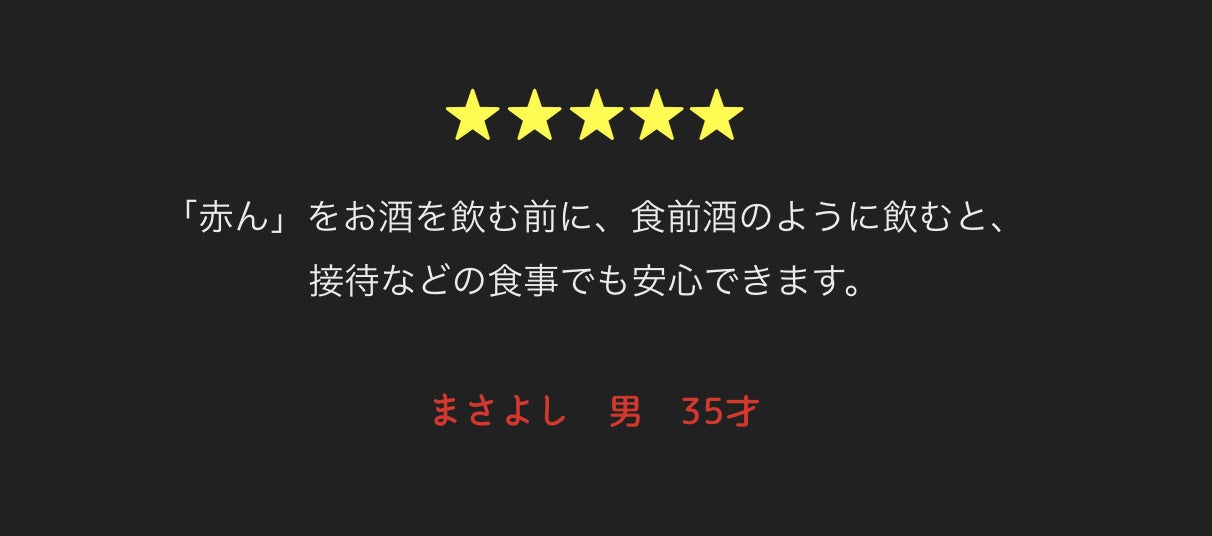 飲酒の風潮がある場面や忘年会や接待の場で飲酒を余儀なくされる時など、飲まなければいい、で済まない場面がよくあるのではないかと存じます。加え、お酒が本当は大好きなのに症状が恥ずかしいから宅飲みだけで我慢している、もしくは飲むことをキッパリ諦めているという方が多くいらっしゃいます。どのようなシーンであれ、赤ら顔や体調不良で飲酒を諦めてしまいかけている際に、是非「赤ん」を試していただけたらと思います。