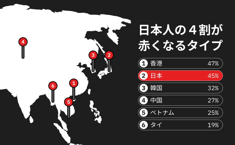 日本で友人と飲みに出かけた際に私は驚くべき光景を目にしました。友人らは顔を真っ赤にしながらビールを飲んでいたのです。この光景に、私は自ずと不思議と疑問を抱きました。その理由は、米国では飲酒による赤ら顔を抑える貼り薬やサプリメントが存在しそれらの商品が日常的に使われているからです。カルチャーショックでした。このことを友人らに告げたところ、彼らはそのような商品について聞いたことはないが、もし日本に存在したら試してみたいと興味を示してくれました。「赤ん」の開発にあたり調査を行ったところ同じように赤ら顔に悩まされ、さらに頭痛や動悸などの体調不良を経験されている方も多くいらっしゃいました。さらに、赤ら顔の理由を知るためアルコールの分解過程を調査し、赤くなるかならないかはアルコール分解中に体内で発生するアセトアルデヒドを分解できる体質であるかないかの問題であることを突き止めました。世界中で日本人は特に、赤くなる体質である人が多く、人口のおよそ4割がそうであることがわかりました。
