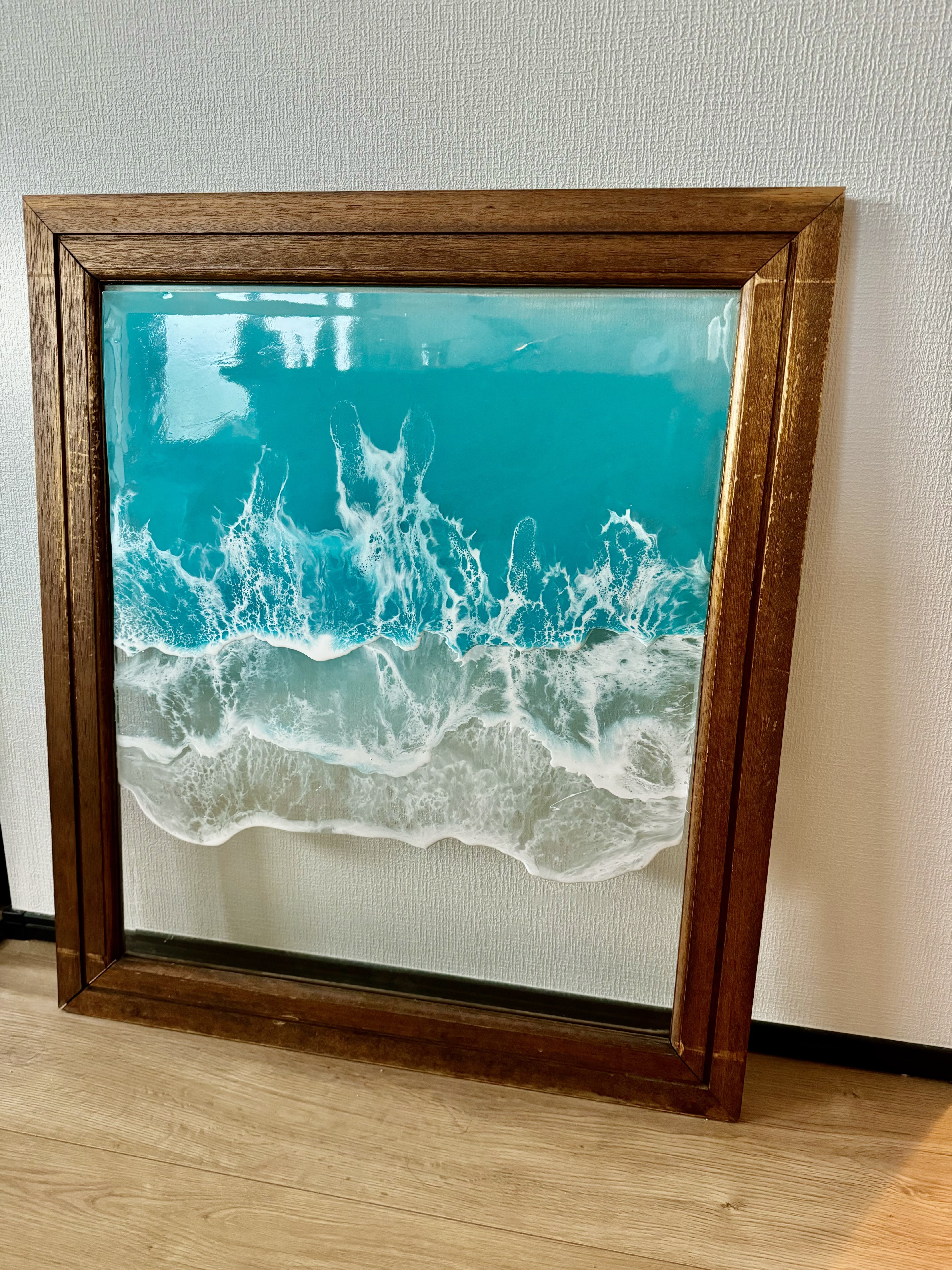 BarBarBarから持ってきたガラスの木枠にオーシャンアートを施しました。