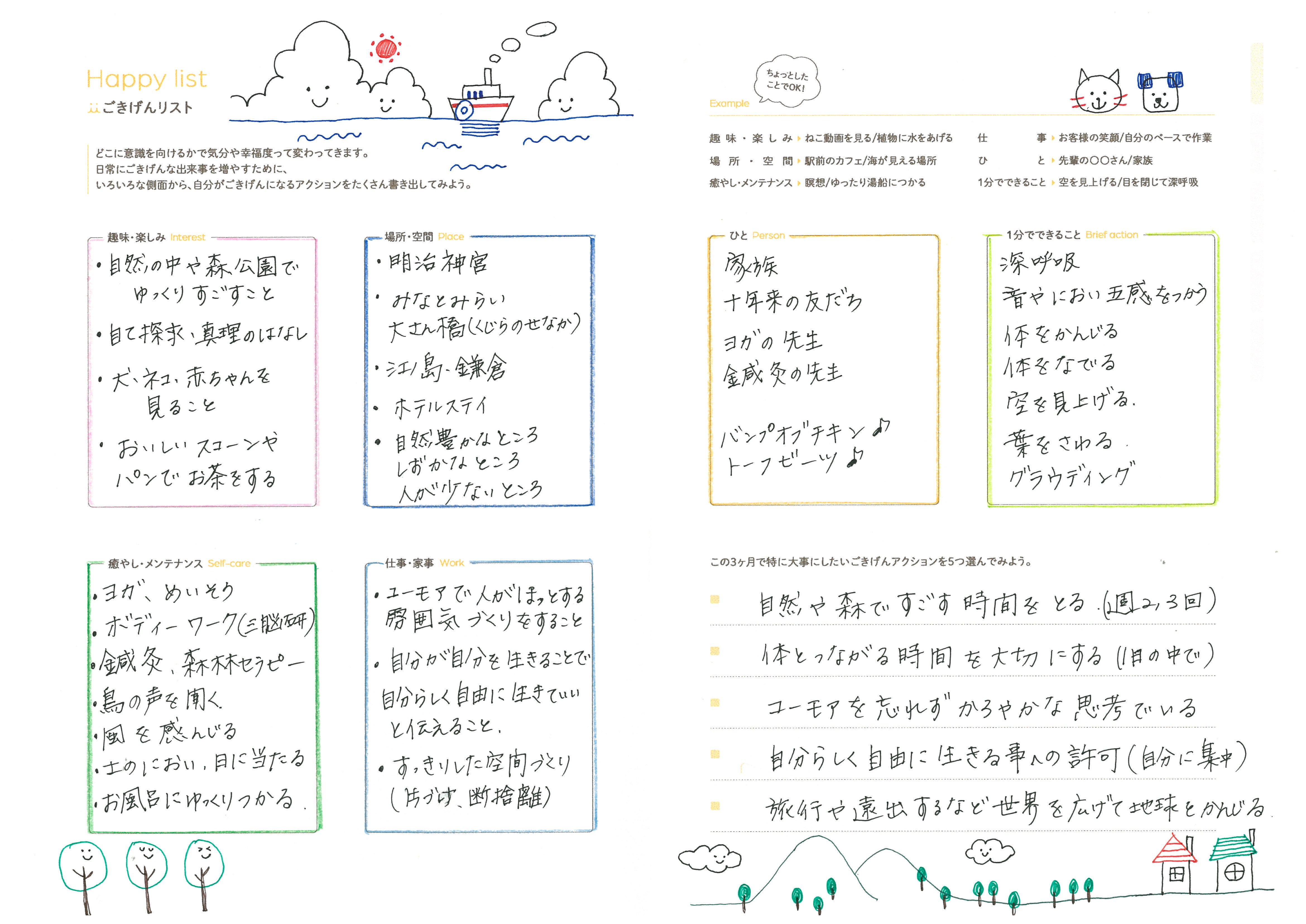 > ごきげんになる事を書き出すことで、自分の「好き」がよくわかり、ごきげんになる事を意識的に取り入れよう!と思えました。項目ごとに枠になっていて、とても書きやすかったです。この3ヶ月で大事にしたいアクションは、具体的にこんな風に行動していこうとイメージに繋がり、ごきげんを選択していった先の「未来の自分」が楽しみになりました。色をつけたり絵を描いたり、オリジナルなごきげんリストにできて楽しかったです。