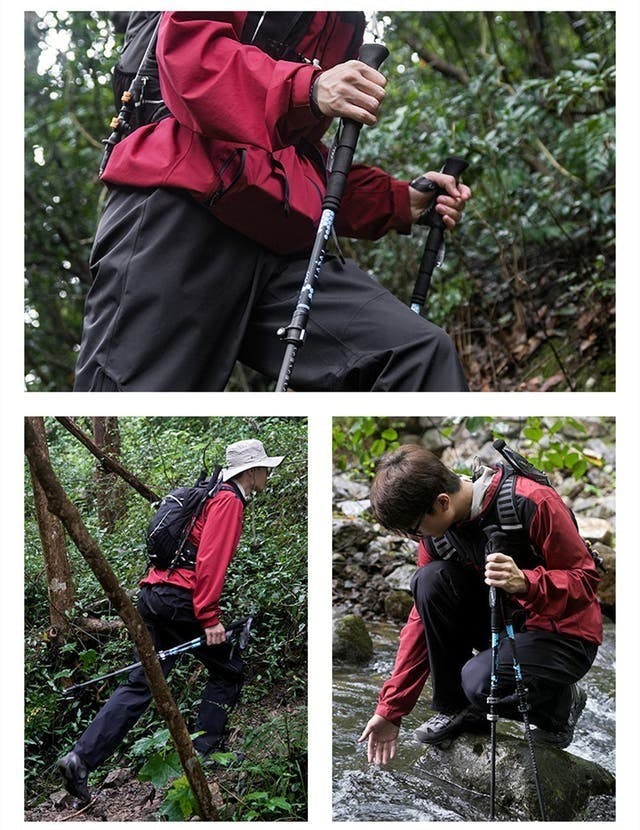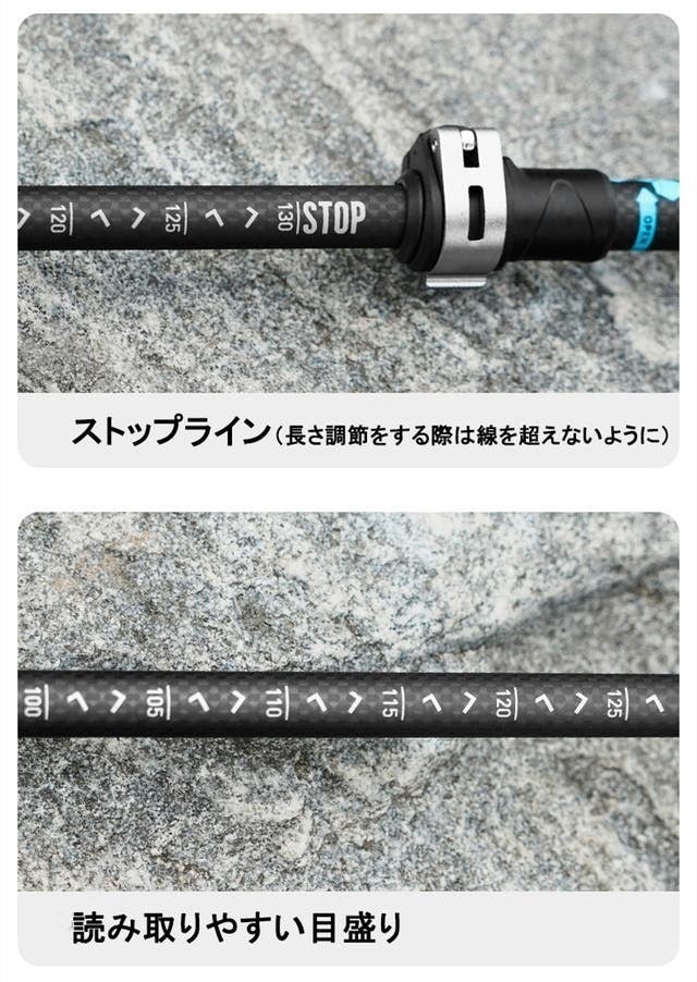 ポール全体にはカーボンファイバー素材が採用されており、そのため耐久性がありつつも、1本あたりの重量は約165gと非常に軽量です。岩や木の根のある登山道を歩く際、その軽さとコンパクトなデザインを生かして、優れた機動性を発揮できます。