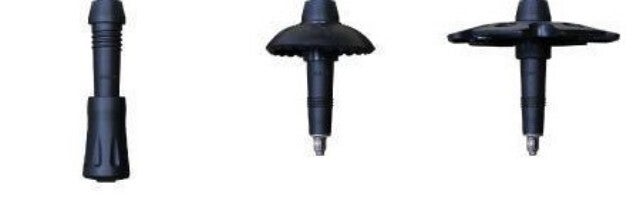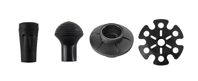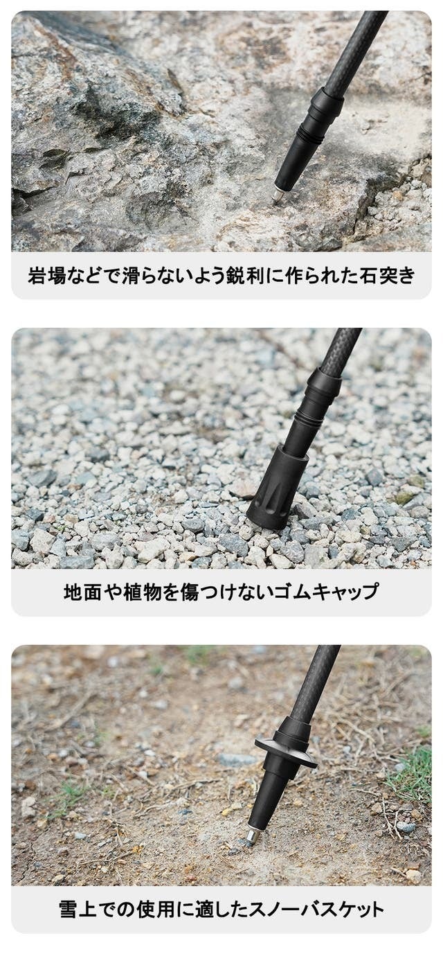 先端部の石突を覆うように装着する「ゴムキャップ」は、登山中に自然環境や登山道の保護ができます。先端付近に付いているリング状のパーツ「バスケット」は、ポールが岩の隙間などに入り込むのを防ぐ役割があり、雪上でも使用できます。