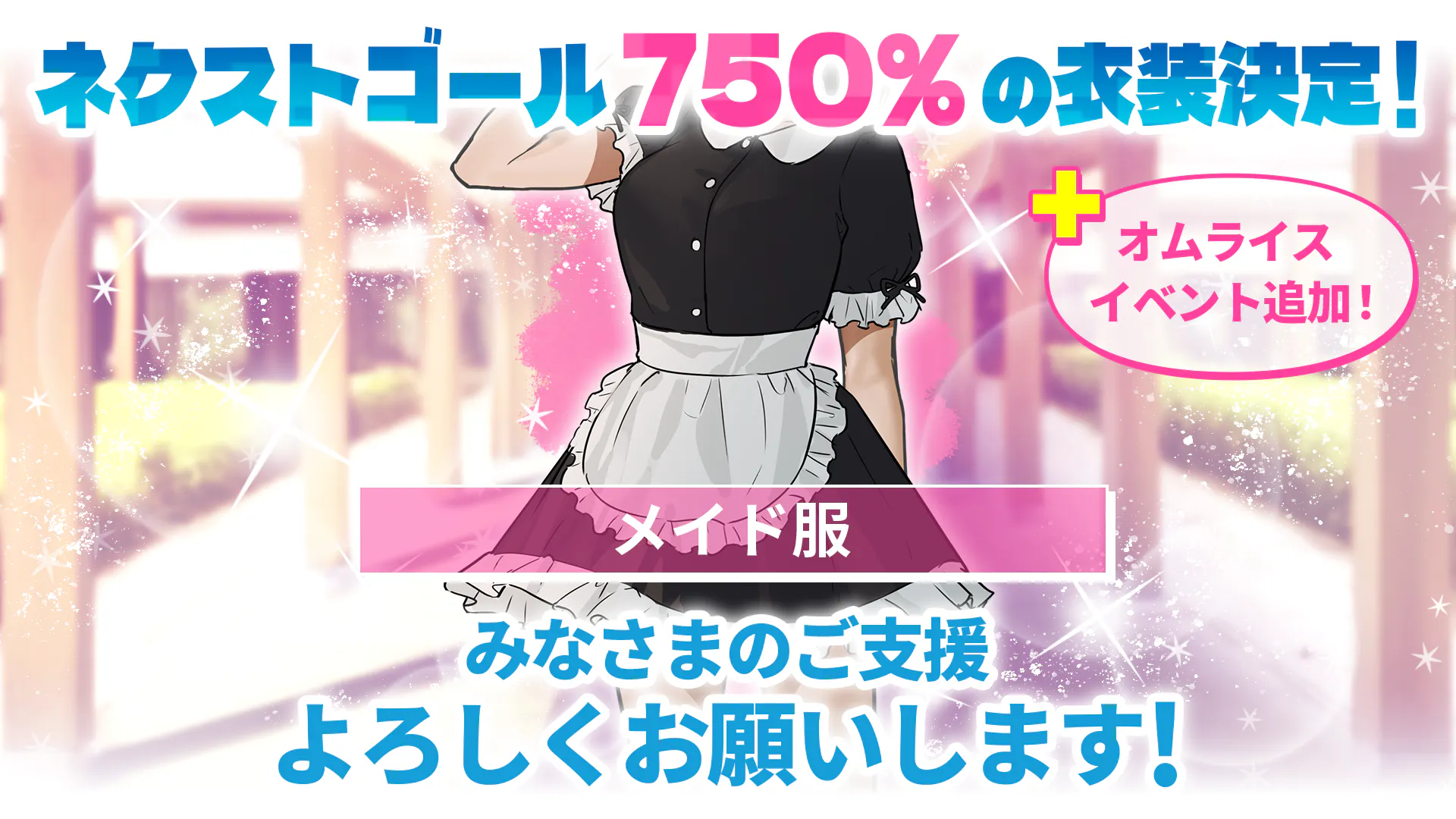 今回のネクストゴールが達成されると、ヒロイン「夕陽さくら」のメイド服が登場し、オムライスに関連するシナリオが追加されます。メイド服姿のさくらや、オムライスにメッセージを書くシチュエーションを楽しんでいただける予定です。