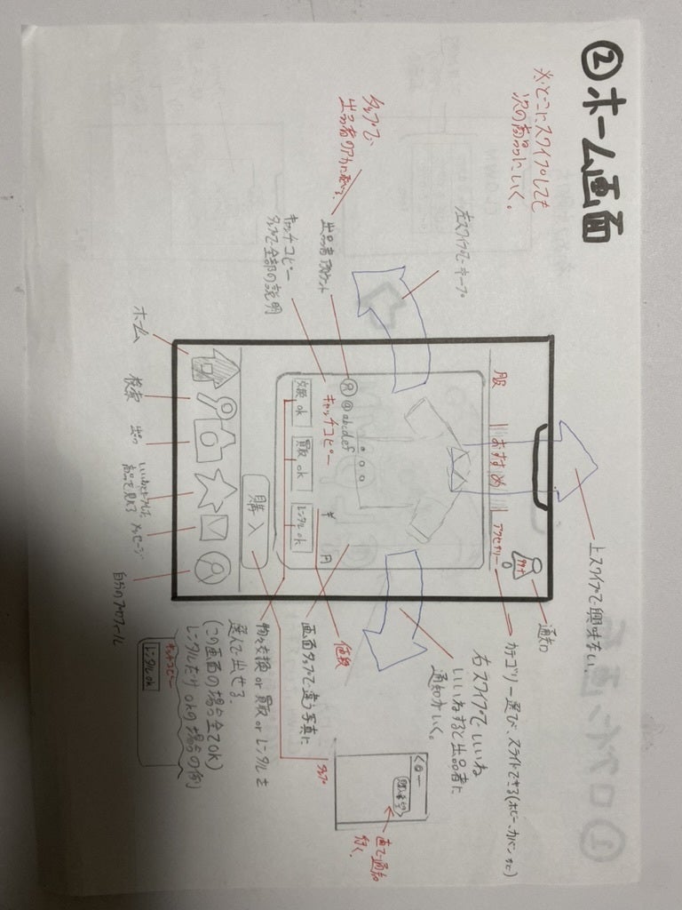 まだアプリは完成していなく、イメージだけだがこのように従来のフリマアプリと違い、商品が一つ一つ「いいね」と「興味無し」にスワイプで分けることができ、Tik Tokなどのように移動時間、暇時間に特に欲しい物がなくてもぼーっと見てられる点が現代の忙しい人達にヒットしやすいアプリの形である。