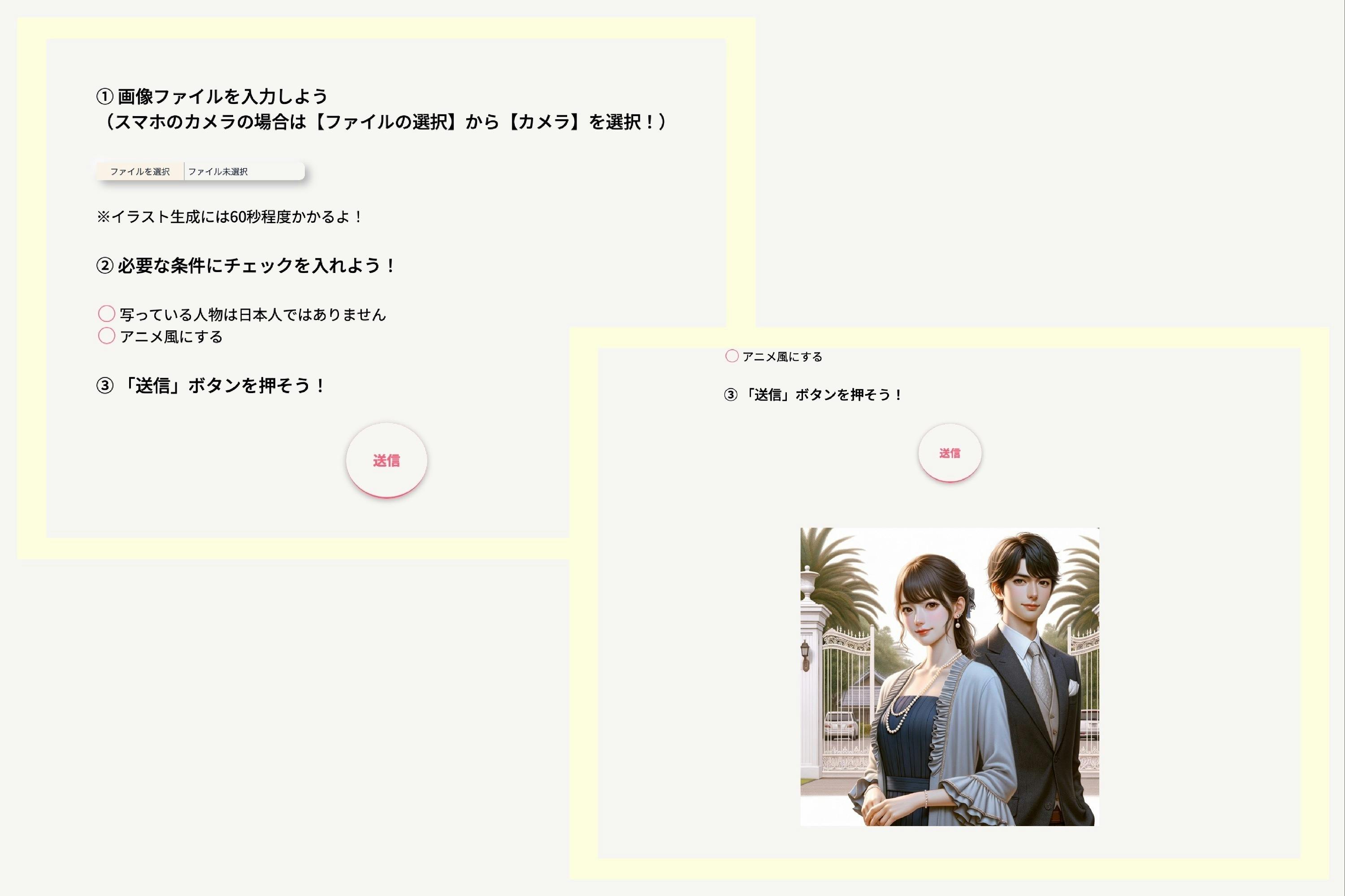 このWebアプリは、みなさまのスマートフォンやパソコンでインストールなしで使用できて、人物写真から様々な魅力的なイラストを生成します。
