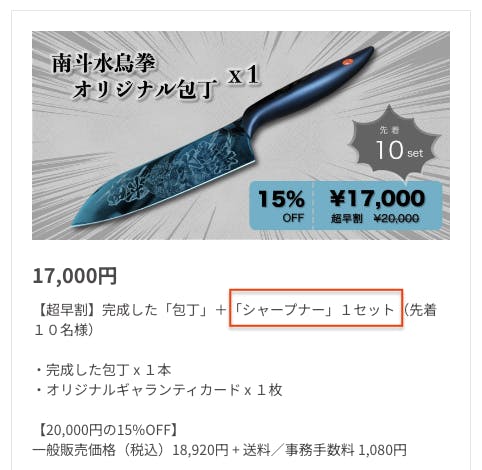 当リターンには、シャープナーは付属しておらず、「包丁+ギャランティカード」のリターンとなります。