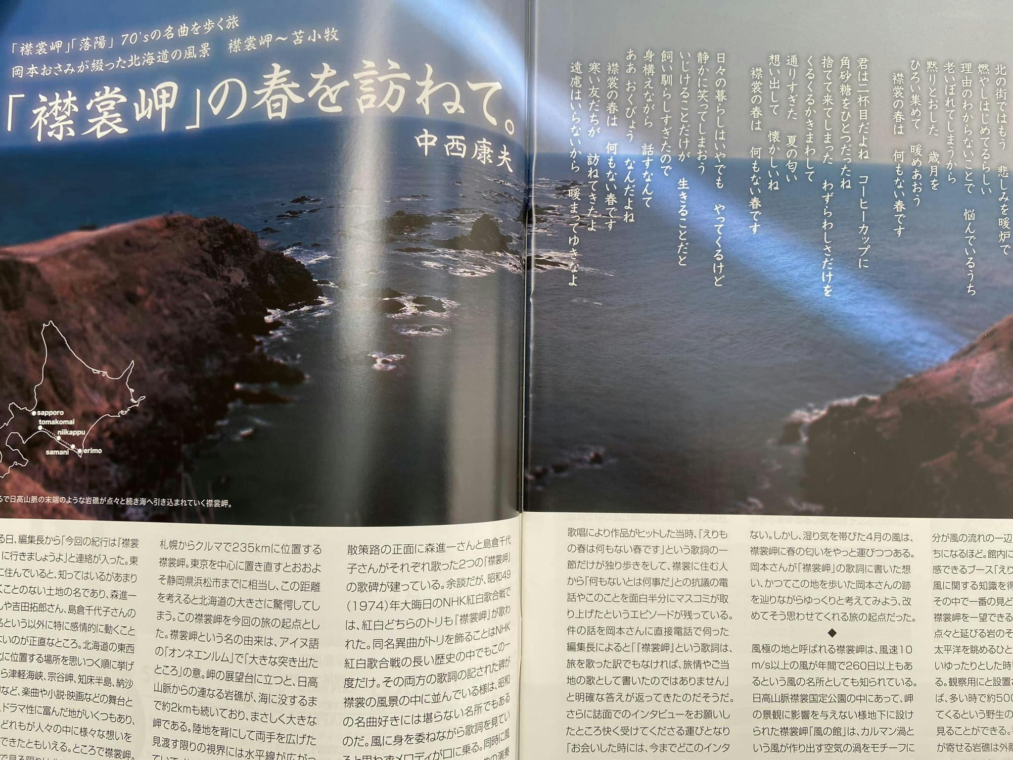 今回の旅ではたくさんの濃密な出会いがあったが、この雑誌の特集編集に長年携わってこられたプロデューサーさんとの出会いが際立って思い出深い。お電話をいただき滞在している家の近くまで車できていただき、この近くにいい喫茶店がありますので、そこに行きましょうと10分ちょっと走ったところにある店を紹介いただいた。古い倉庫を改装した雰囲気のある店は少し照明が暗くて、しかしとても落ち着く店だった。札幌の喫茶店文化はよく語られているが、雰囲気あるなと、いっぺんに気に入ってしまった。コーヒーを頼んだ後、改めて名刺交換をした。須田さんからいろいろ聞いていますと切り出し、すぐに本論に入った。この特集を組む経緯や苦労など興味深い話があった。まさに何故私たちが岡本おさみ音楽記念碑を建てたいかという理念に近い話が次々と出てきた。素晴らしい編集でまるで、私たちが取り組んでいる内容を何年も前から実践されている事実に圧倒された。あの時代、60年代、70年代の文化がどのように生まれ、育ち、そして壊れていったのかと話が続いていった。それは2人の青春時代へ遡っていくものとなった。岡本おさみさんは何を書こうとしていたのかとなっていった。私の方がかなり年上なので、あの時代への質問を