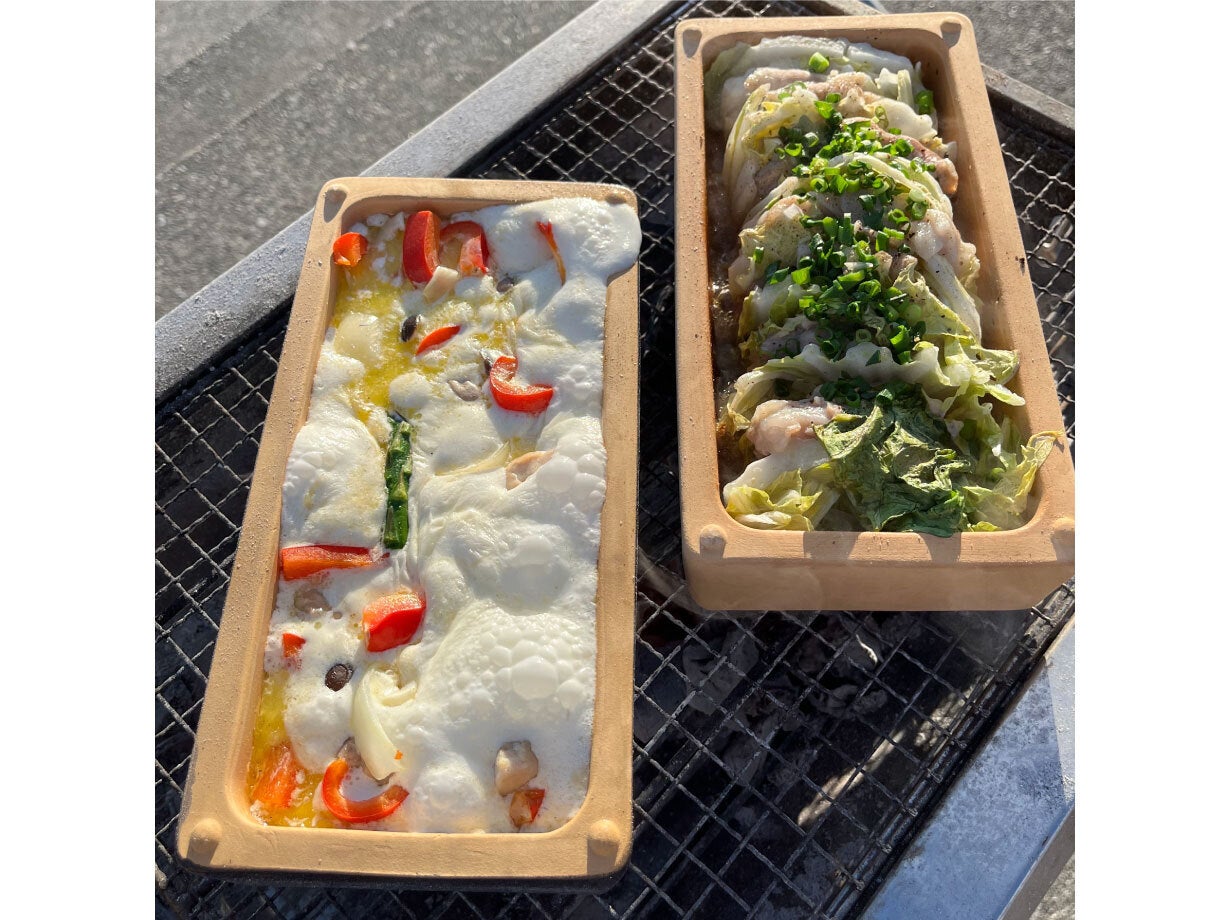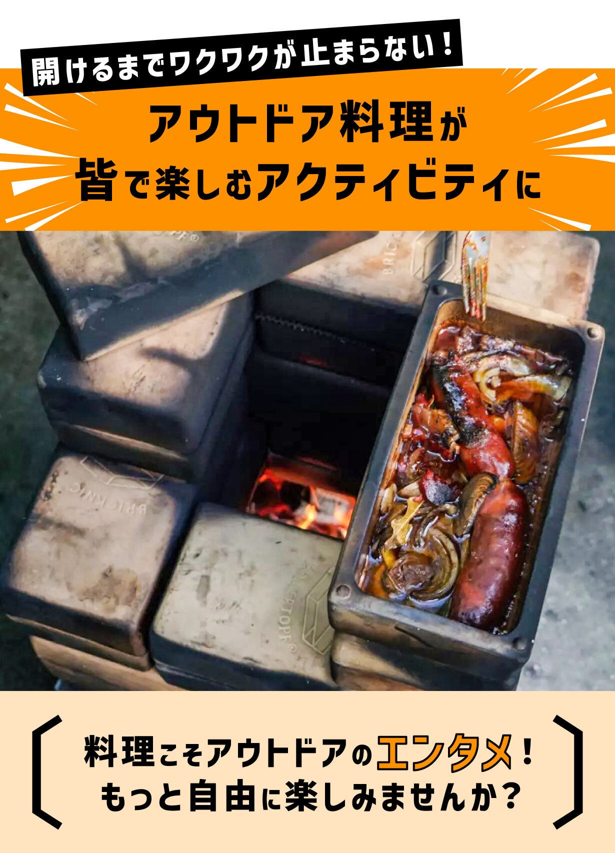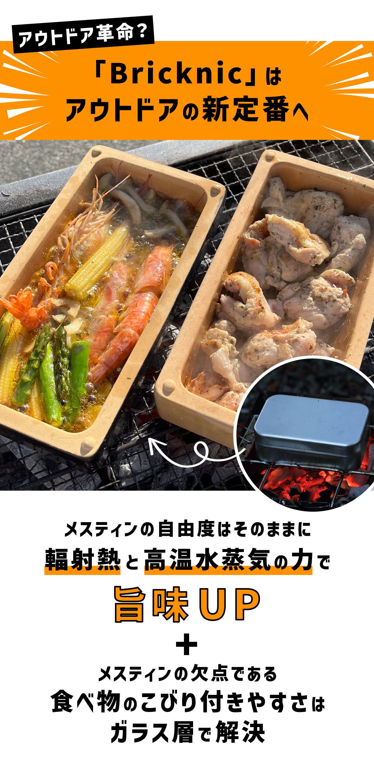 アウトドアの調理器具の定番と言えば「メスティン」ですが「Bricknic」はメスティンの良さはそのままに、天然粘土による2つの熱の力で素材の旨味を凝縮します。