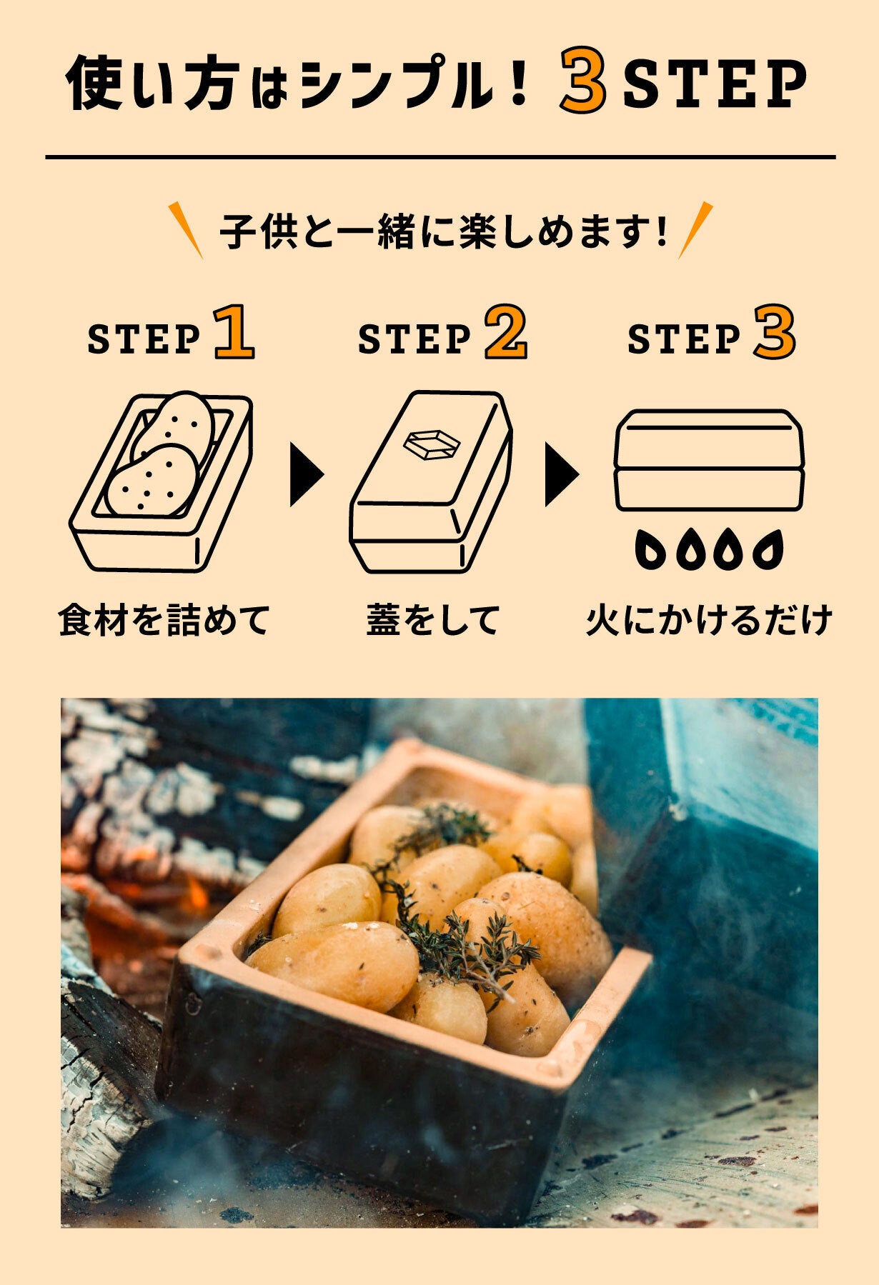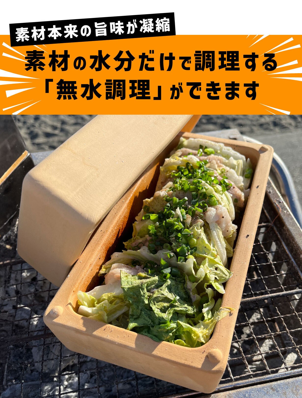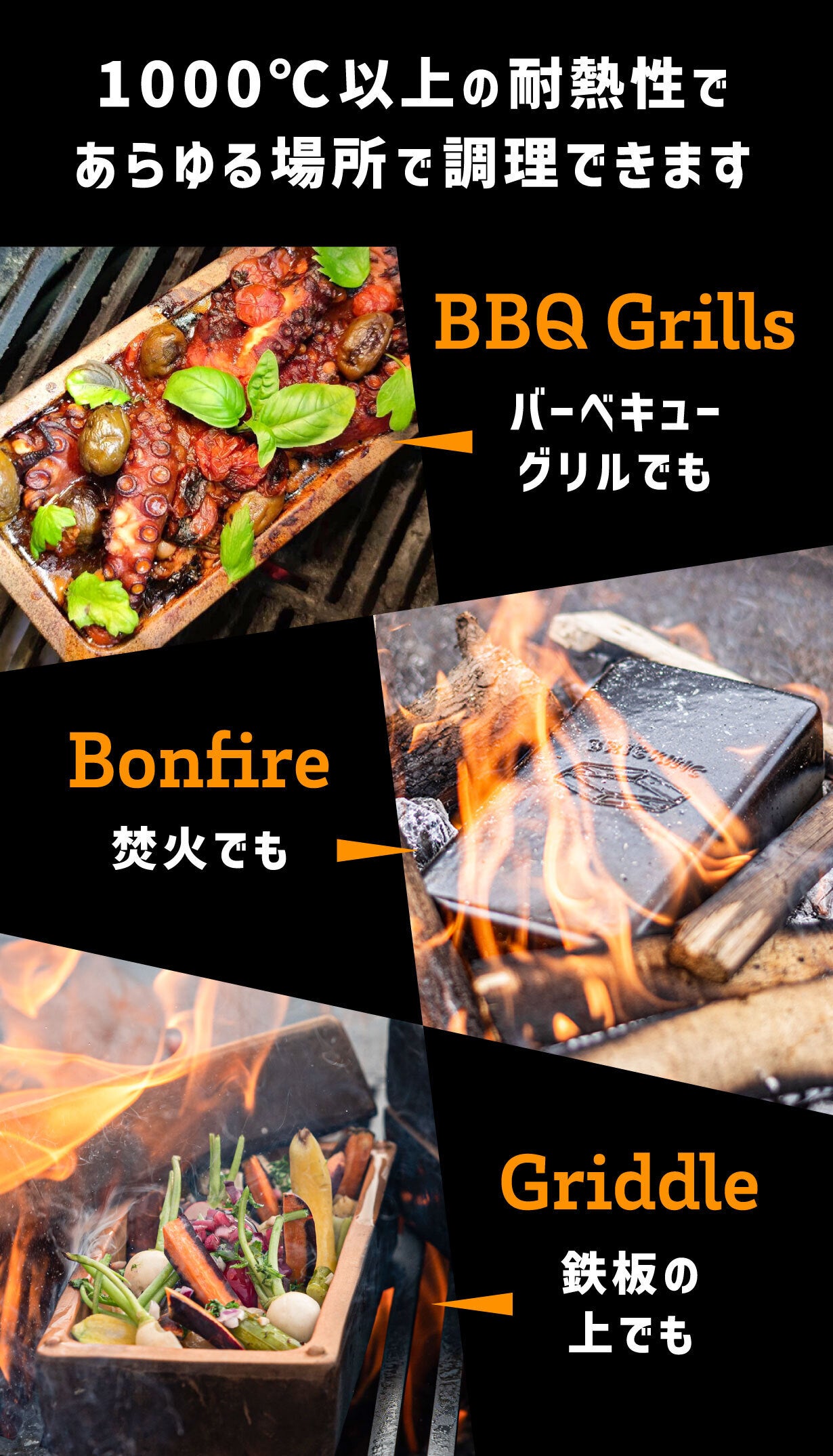 焚火に入れても、バーベキューコンロに入れても鉄板の上でも調理できます。天然粘土+密閉性で石窯と同じ「輻射熱」と「高温水蒸気」で食材の旨味をグッと閉じ込めます。
