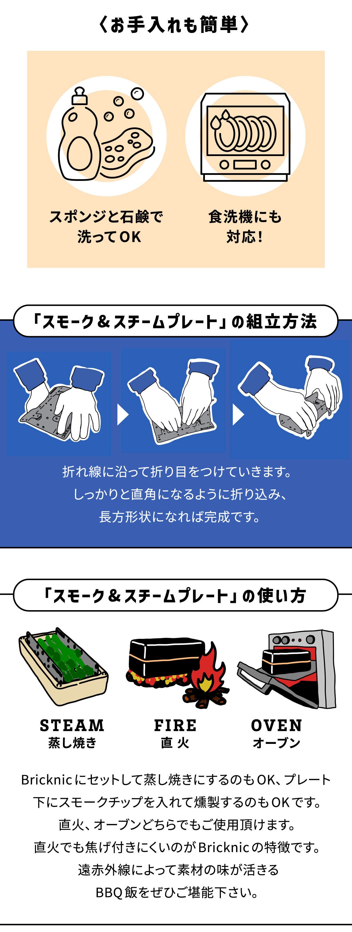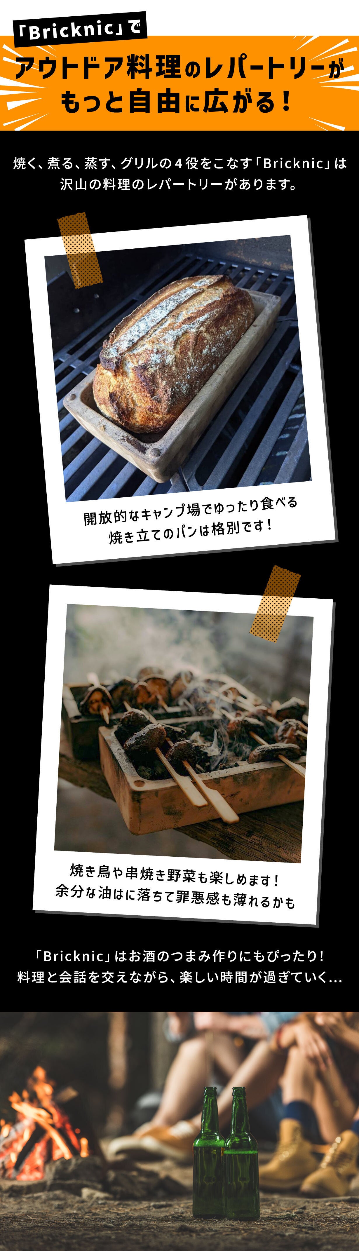 直火、オーブンどちらでもご使用頂けます。直火でも焦げ付きにくいのがBricknicの特徴です。遠赤外線によって素材の味が活きるBBQ飯をぜひご堪能ください。