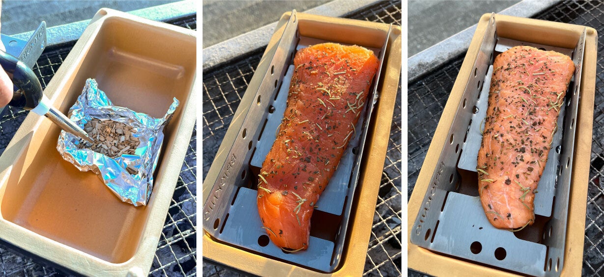 ここで、日も暮れかけてきて、スモーク&スチームプレイトを使い、燻製の王道、自家製スモークサーモンに挑戦です。