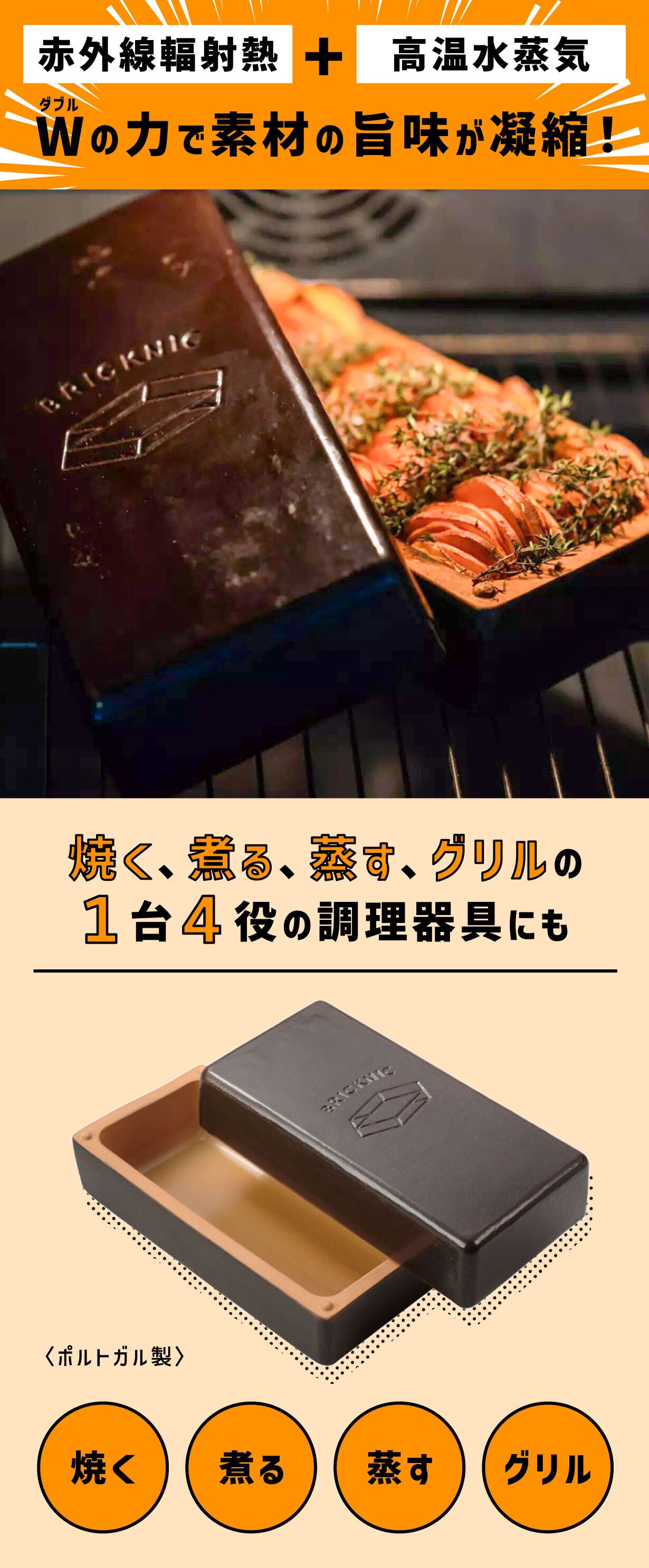 焼く、煮る、蒸す、グリルの調理に適していて「Bricknic」の旨味を逃がさない調理器具としての優秀さ。