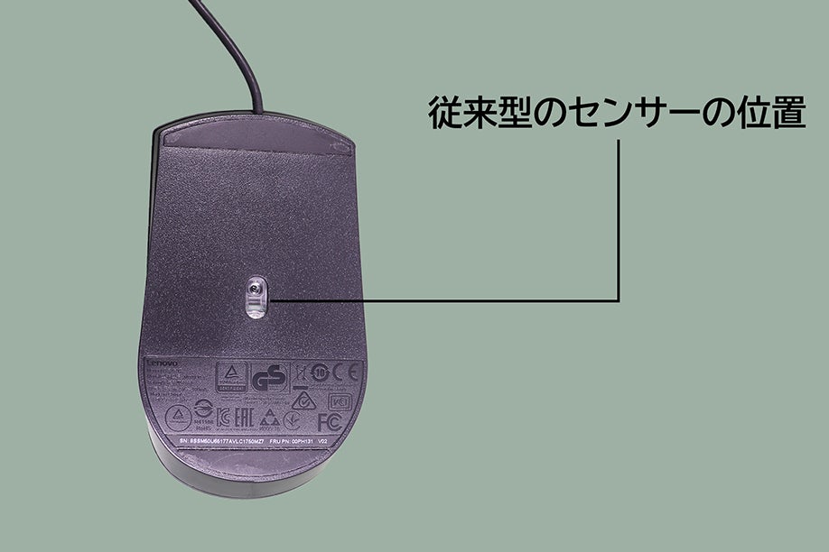 従来型の前部はクリックエリアで、後部は手のひらを支える役割になっています。また、センサーの位置も後部にあります。