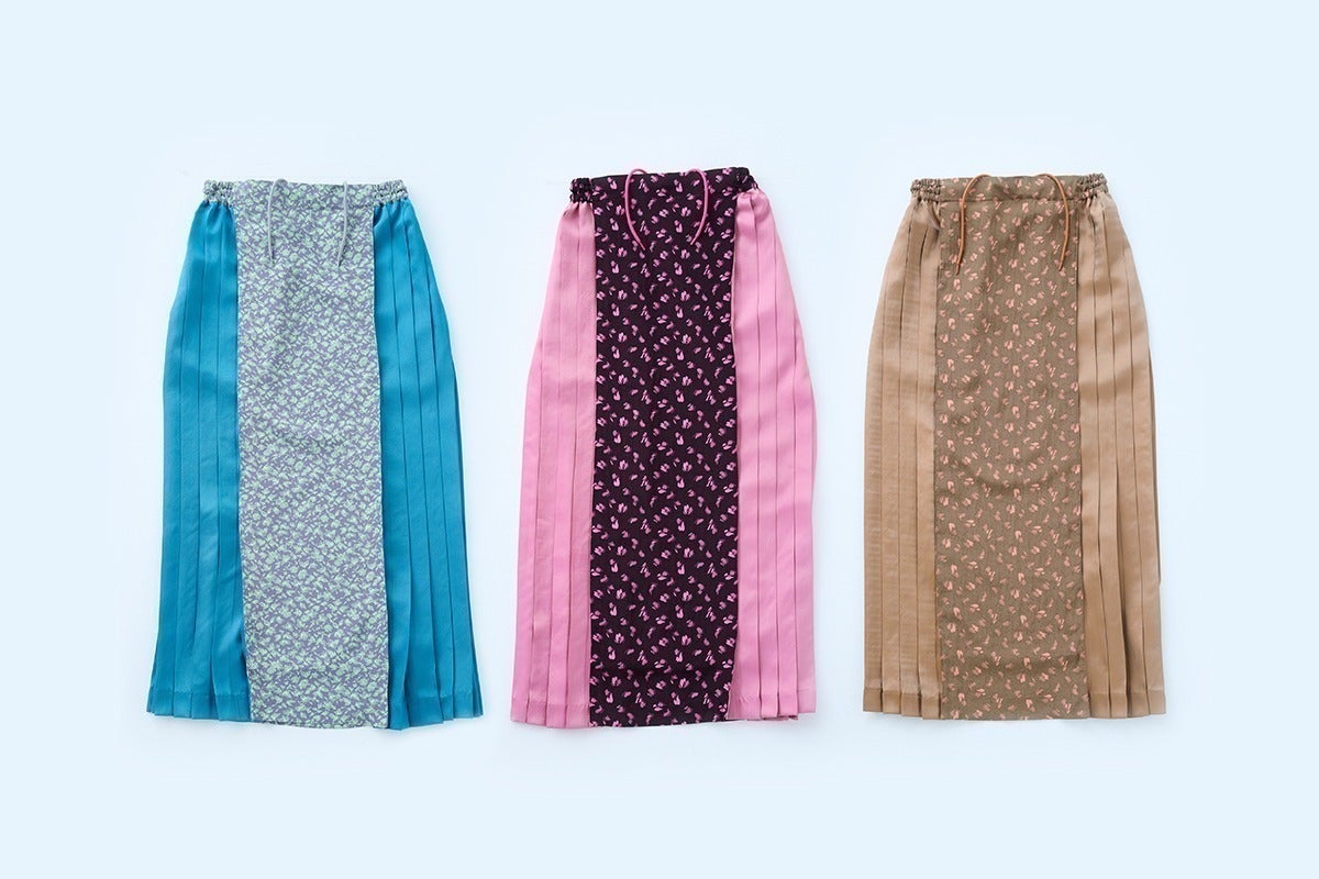 カットソー素材でできた着物スリーブのプルオーバーとサイドプリーツを施したロングスカート