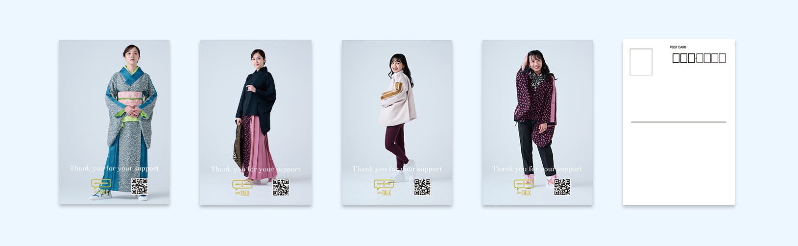CAMPFIREからご支援(先行予約)いただいた方には、リターン商品と一緒にサンクスカード(全2種類)&ポストカード(全4種類)をお送りいたします。1つのリターン商品につき、サンクスカードとポストカードの各1枚、2枚セットが付属されます。カードの種類は選べません。