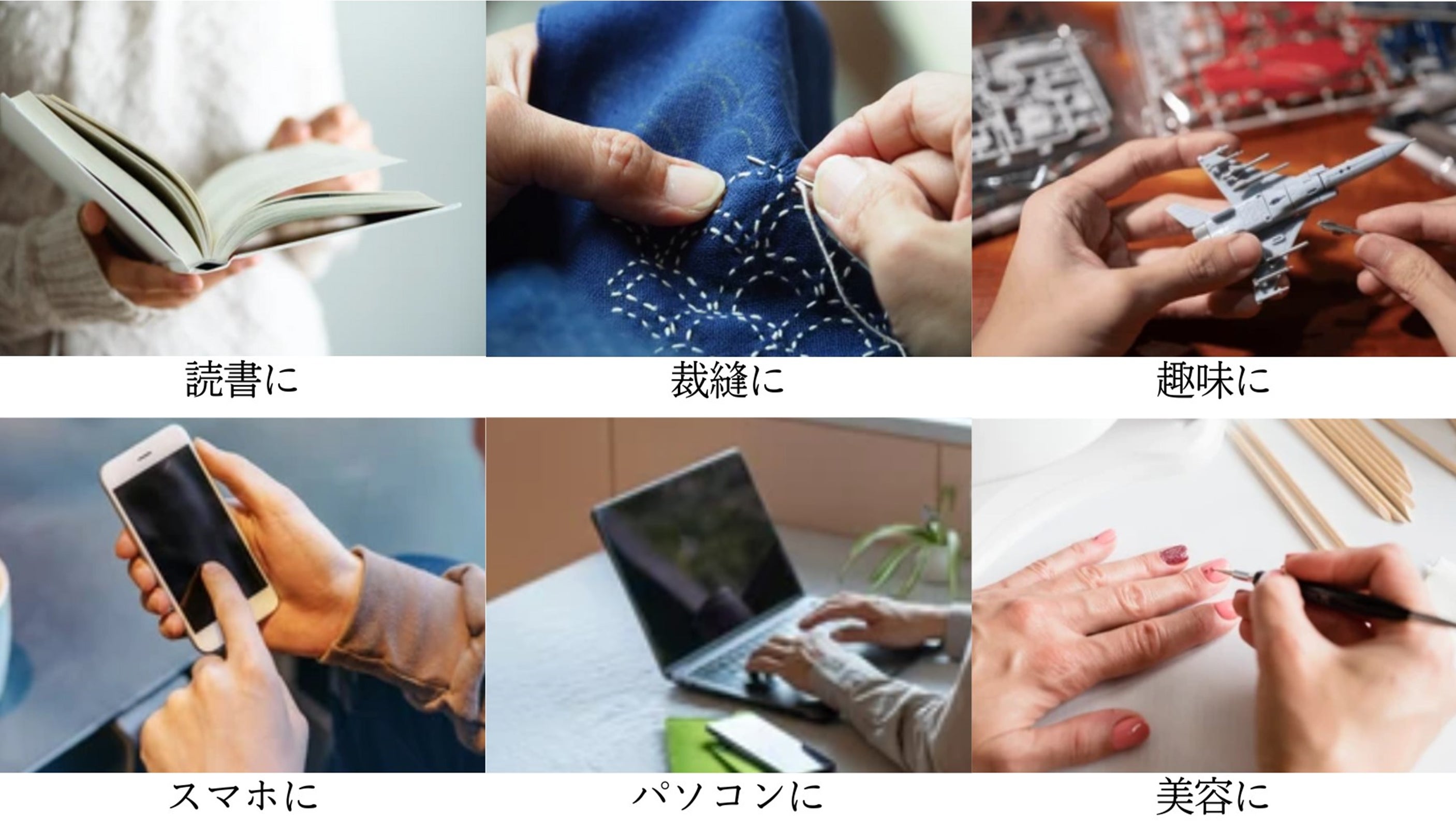 本や新聞などの文字を読むときには疲れにくく見やすい1.6倍レンズ、裁縫など手元の細かい作業をするときはより大きく見える2.0倍レンズ、といった使い分けができるのもマグラス4メーションならでは。