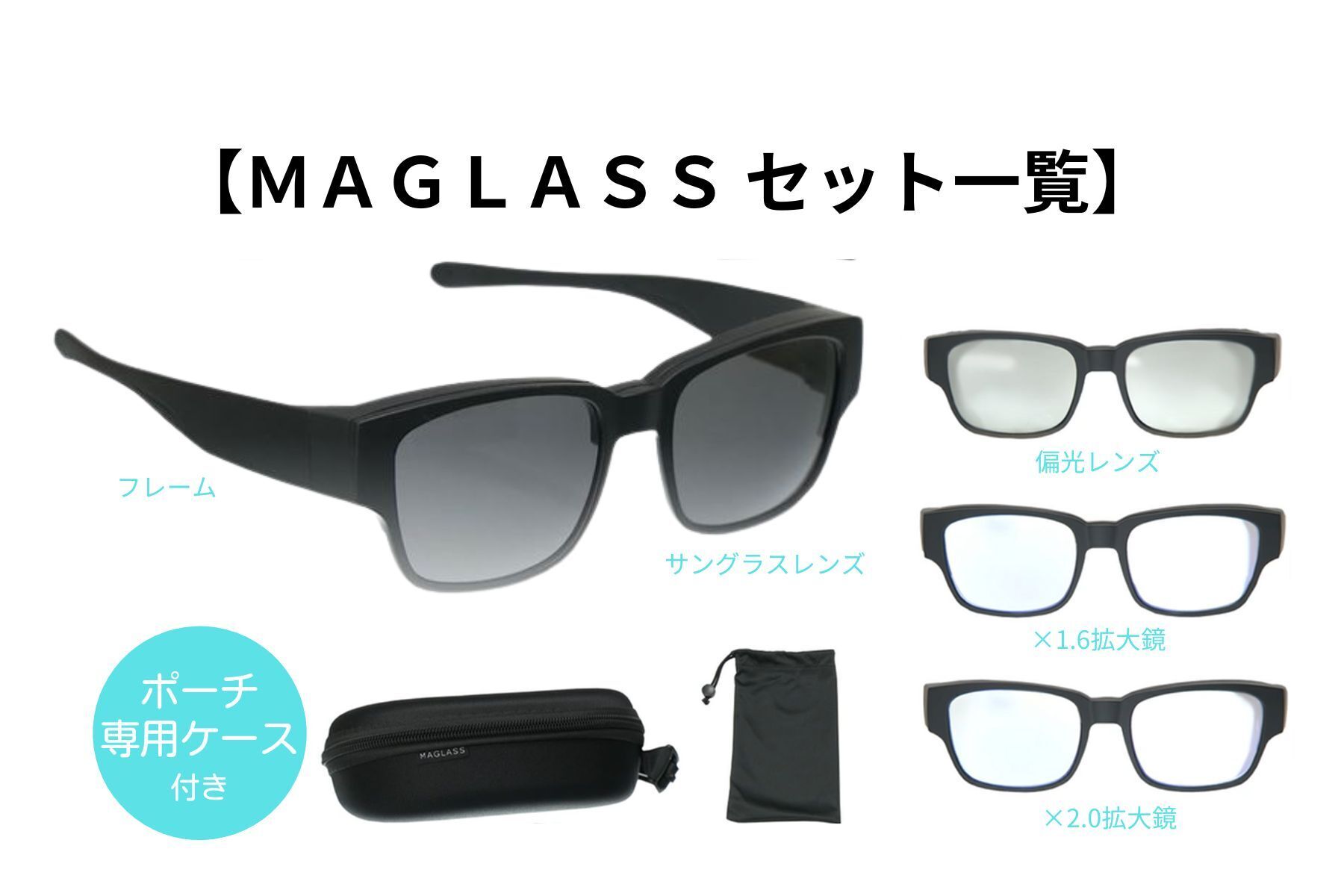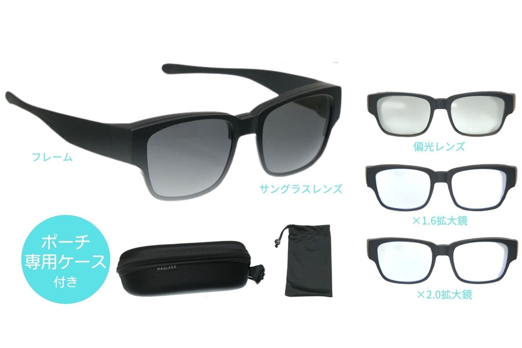 【セット内容】フレーム、レンズ4枚(サングラスレンズ、偏光機能付きレンズ、拡大鏡1.6倍レンズ、拡大鏡2.0倍レンズ)、ケース、ポーチ、クリーナー、取扱説明書