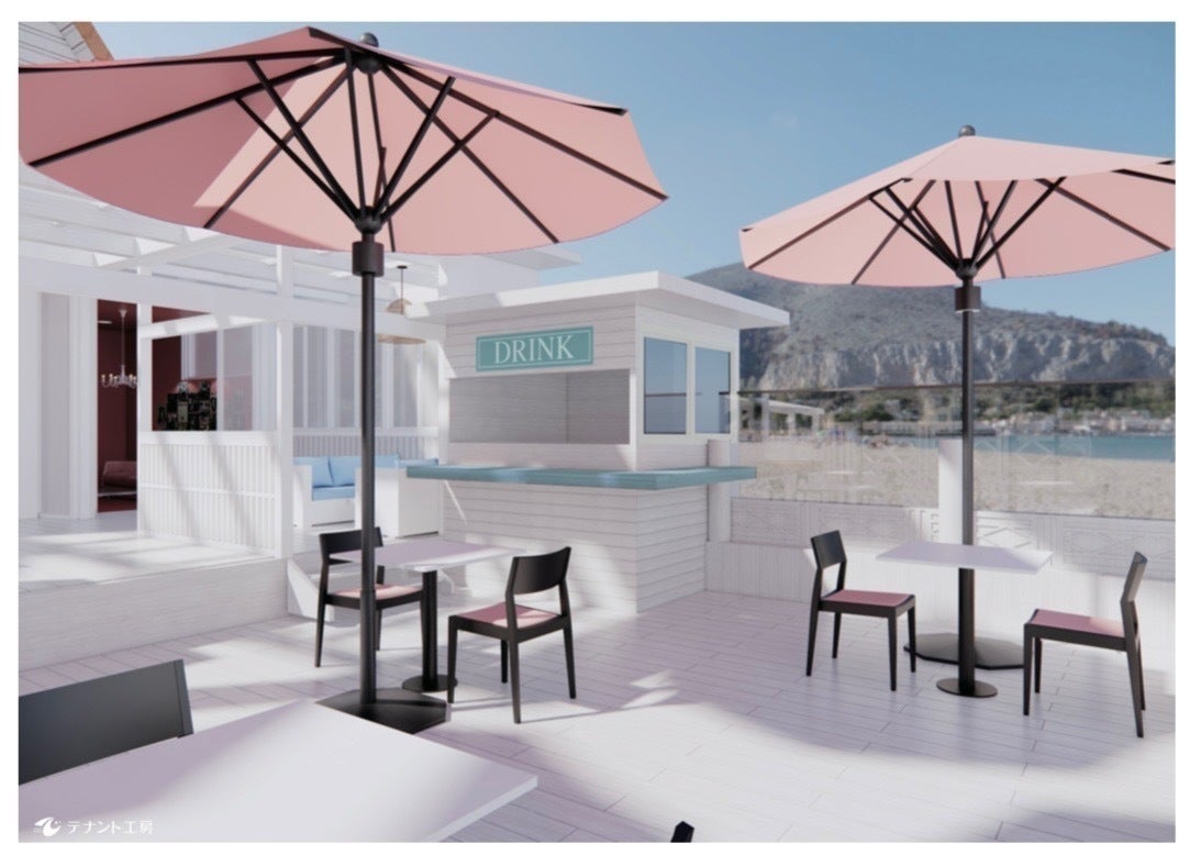 まず、眺望バツグンのテラスはホワイト基調のフロアへピンクのパラソルをずらりと並べ、ロイヤルハワイアンホテルをイメージしたピンクの外装とともにハワイのワイキキビーチを再現。