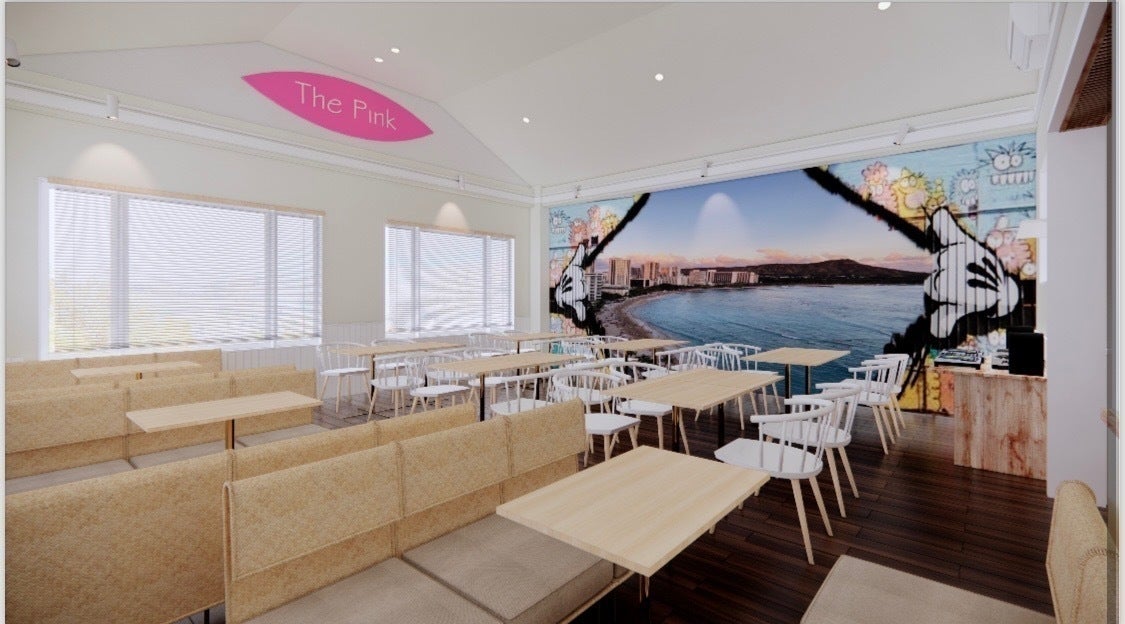 店内34席&VIPルーム8席、テラス32席の広大な店舗スペースは、ハワイを訪れたことがある人もない人も〝THE PINK〟へ来店していただければハワイを感じていただけるように、ハワイの有名スポットをふんだんに詰め込んだ映え空間で構成していきます。