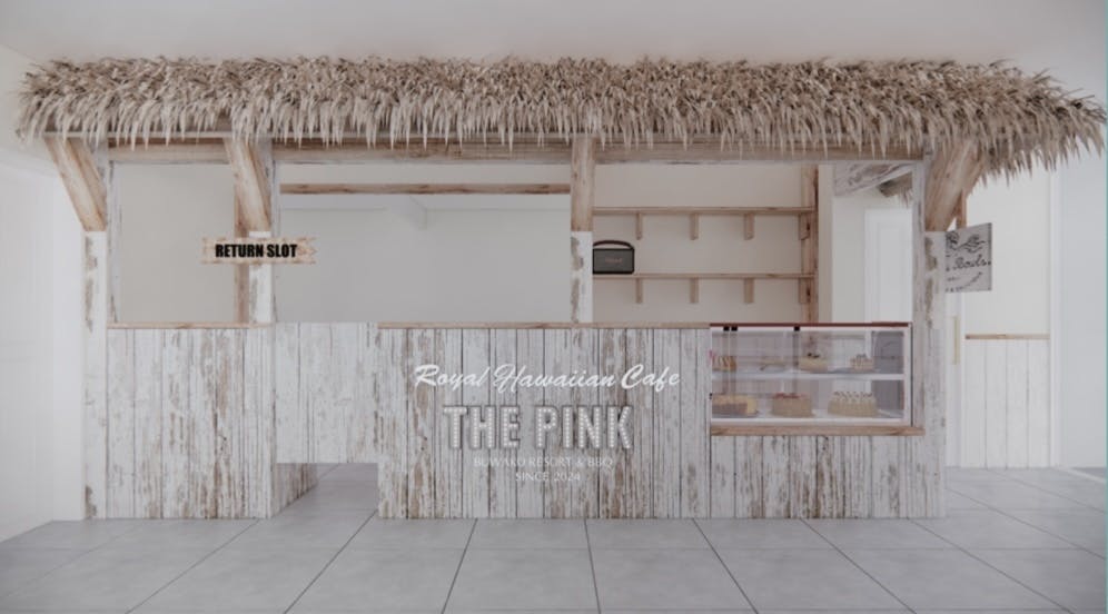 店内34席&VIPルーム8席、テラス32席の広大な店舗スペースは、ハワイを訪れたことがある人もない人も〝THE PINK〟へ来店していただければハワイを感じていただけるように、ハワイの有名スポットをふんだんに詰め込んだ映え空間で構成していきます。