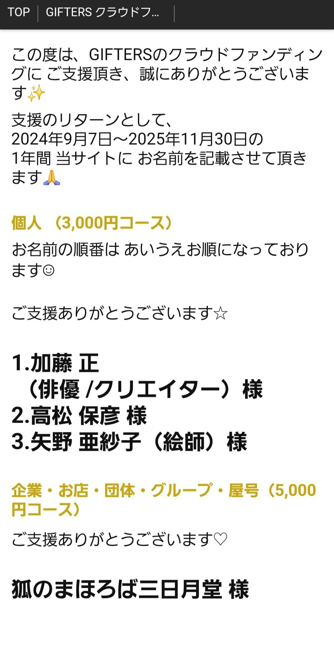 ※今回、個人名の3,000コースとお店、企業、グループ活動の5,000円コースは、支援者様からすると、分かりづらかったかなと後々、考えました。