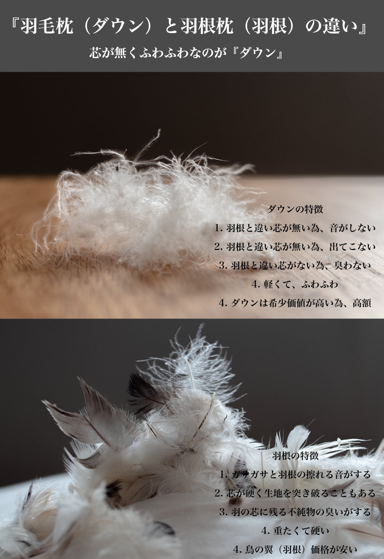 一般的な羽毛枕はダウン50%以下の『羽根枕』です!