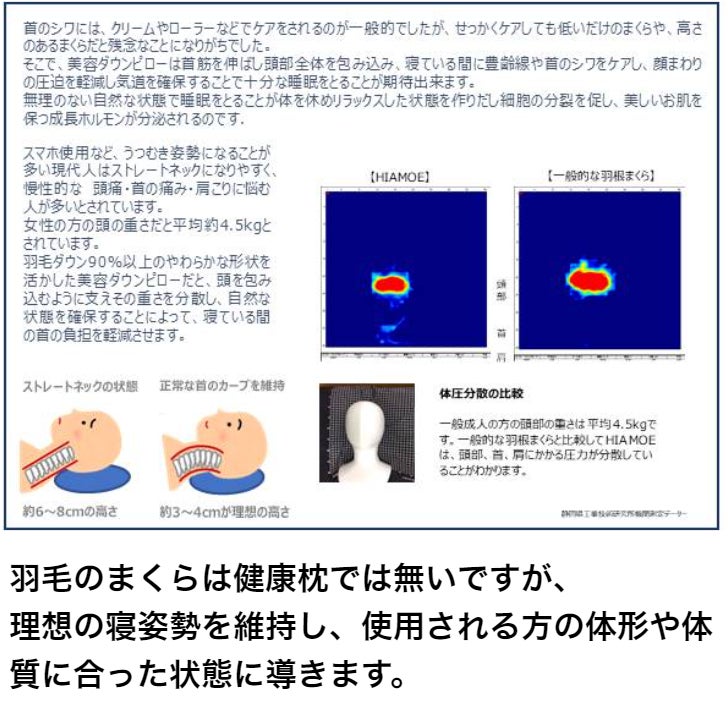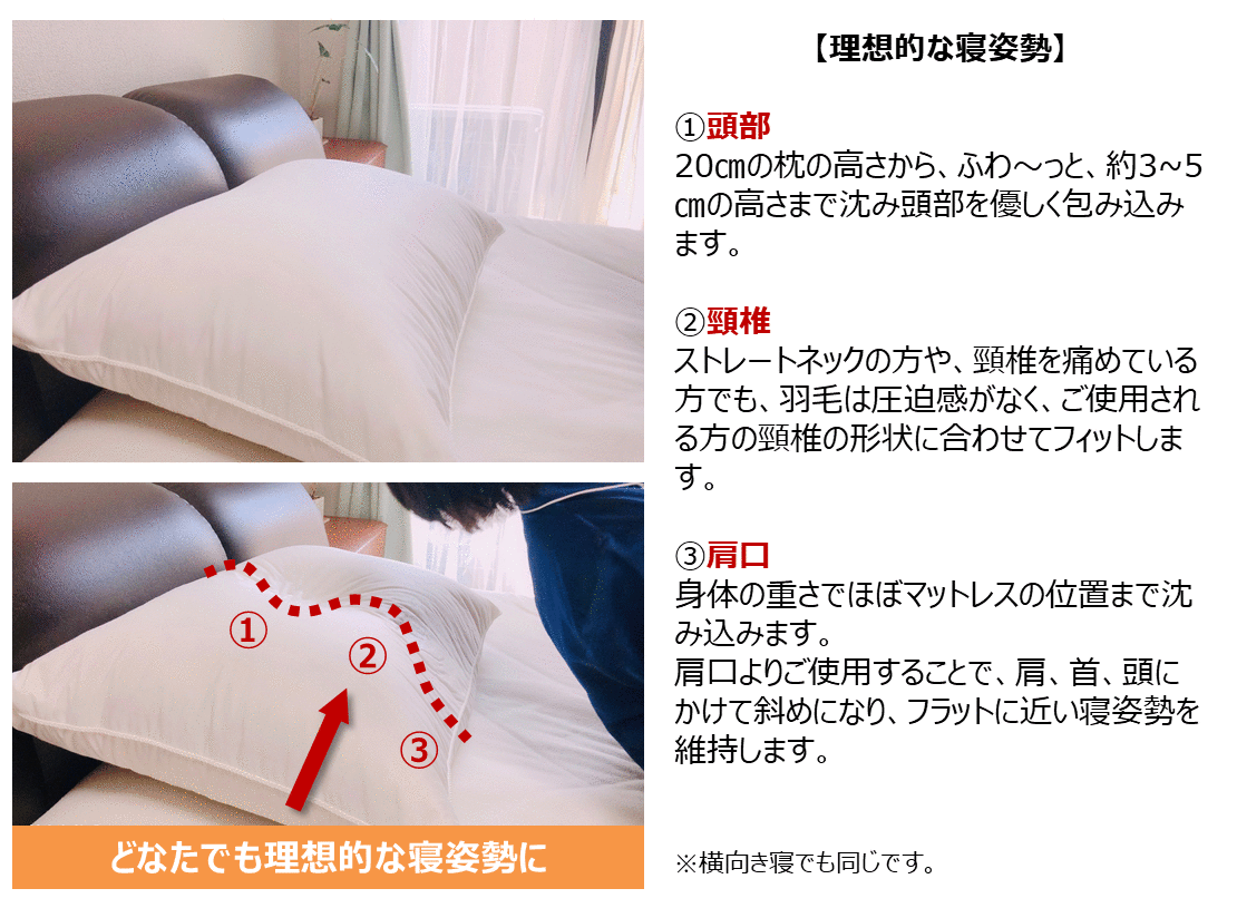本物の羽毛枕は頭部、頸椎の重量で体圧分散し理想の寝姿勢に導きます。