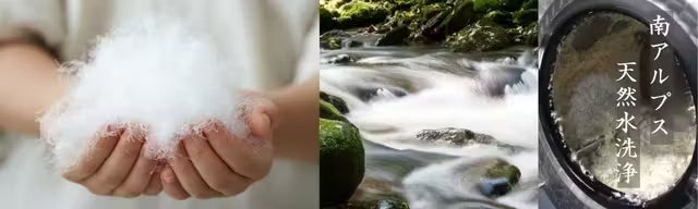 白州工場がある山梨県白州町は国内でも有数の水の郷で、多くの食品会社の拠点がございます。甲斐駒ケ岳より浸透し、数十年掛け湧き出す地下水が世界的に見ても珍しい超軟水のため洗浄に優れている水質です。 さらに約40度の温度まで温め羽毛洗浄に使用しています。たっぷりの天然温水を使用することにより、洗剤を使用しなくても【JIS】規格の清浄度1000m以上を達成しています。