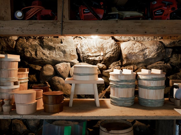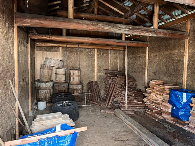 藁がまじった土の壁の倉庫に、昔、古民家で作られていたであろう味噌や梅干し、