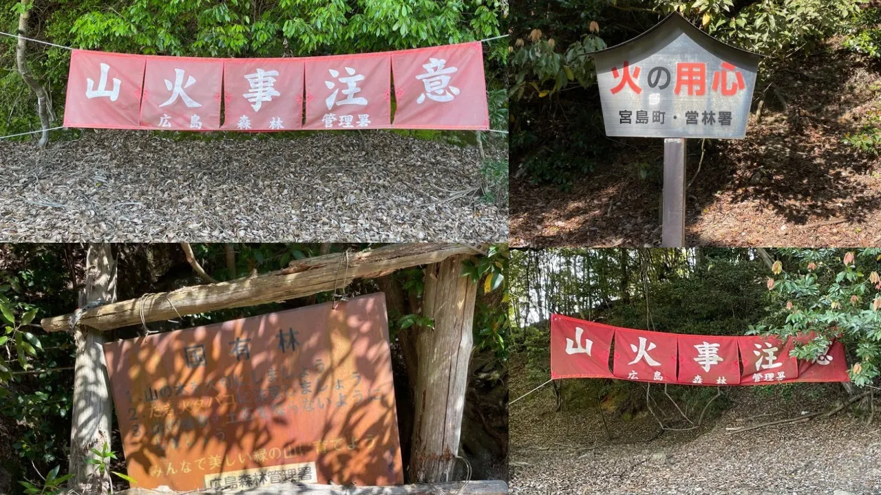 宮島島内にはいたるところに"山火事注意"の文字が並びます。