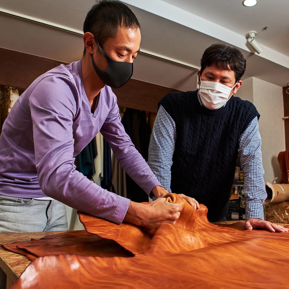 皮革展示会でこの革に出会ったとき衝撃を覚えました。革から感じる強い躍動感、それなのに手触りはしっとり。話を伺うと、やはり革職人の自信作でした。展示会でこの革を購入したものの、この革の良さを生かせる商品の完成には至らず、今回やっと陽の目を見ることができました。