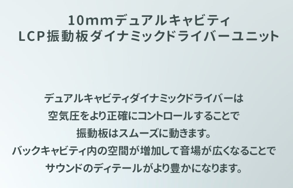 ドライバーユニット:10mm ダイナミックドライバー、6.8mmパッシブユニット