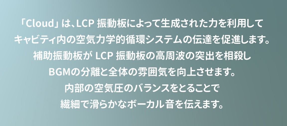 2023年には中低域に特化したコイル式骨伝導ドライバーを搭載した「Wind」で大変好評をいただきました。そして2024年、ウェザーシリーズ第二弾として新たな技術「エアーアシスト振動板」を搭載した「Cloud」が完成しました。