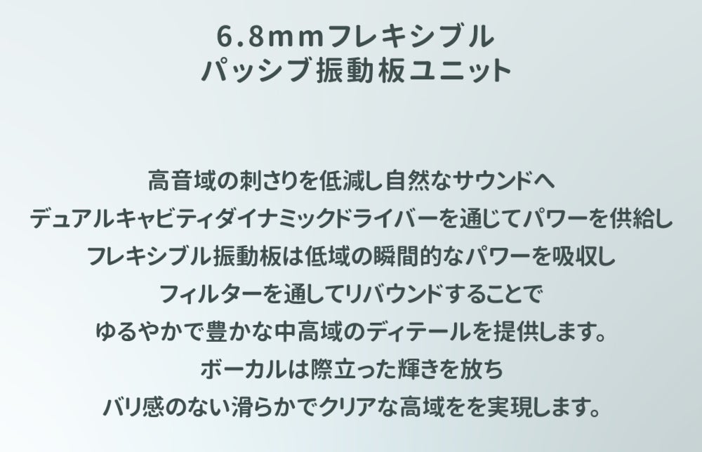ドライバーユニット:10mm ダイナミックドライバー、6.8mmパッシブユニット