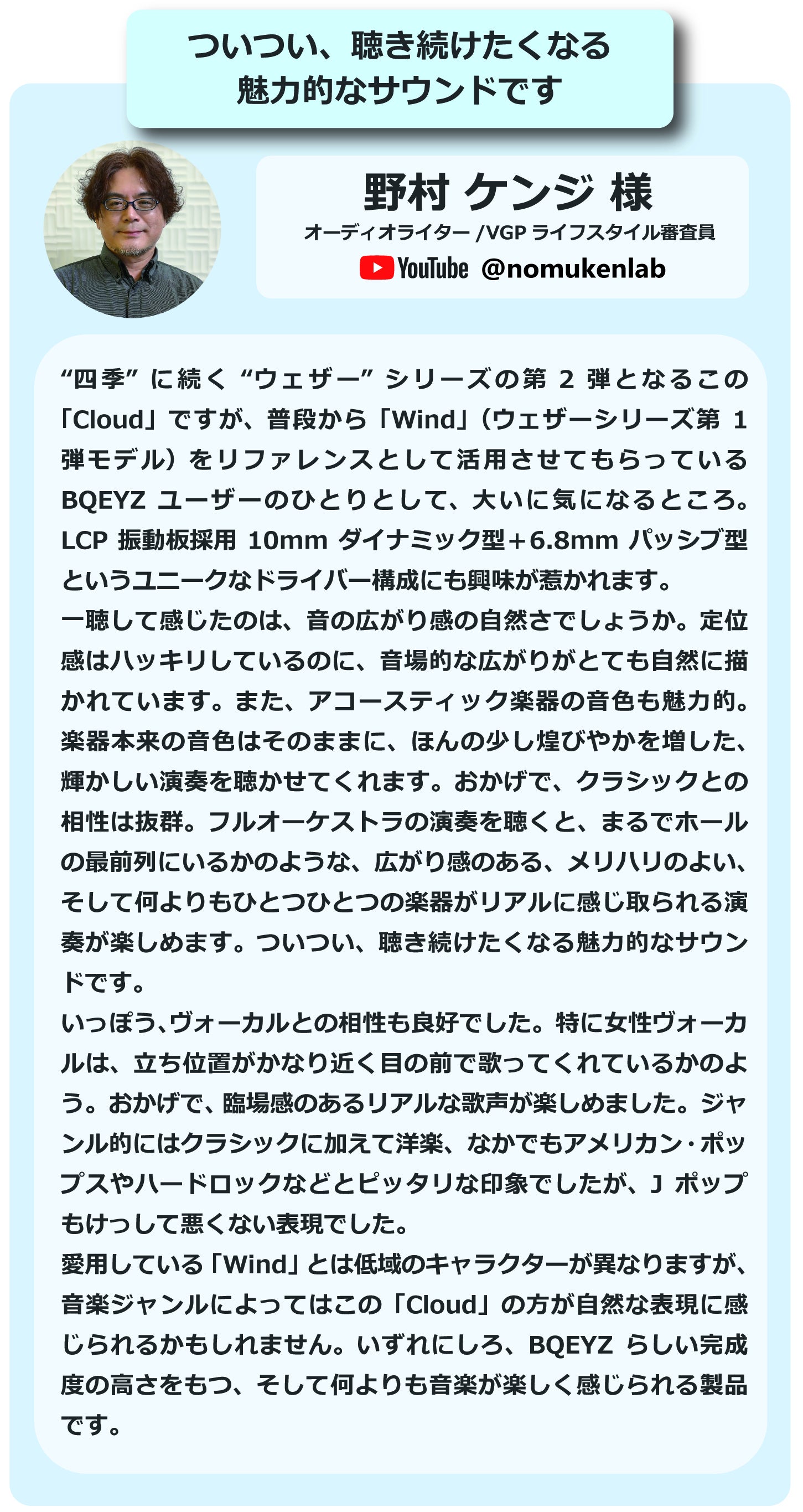 私たちは、BQEYZのイヤホンを通して、皆様に最高の音楽体験を提供することを目指しています。「Cloud」を通じて、音楽が持つ真の魅力を再発見していただけることを願っています。このプロジェクトに心からの支援をお願い申し上げます。